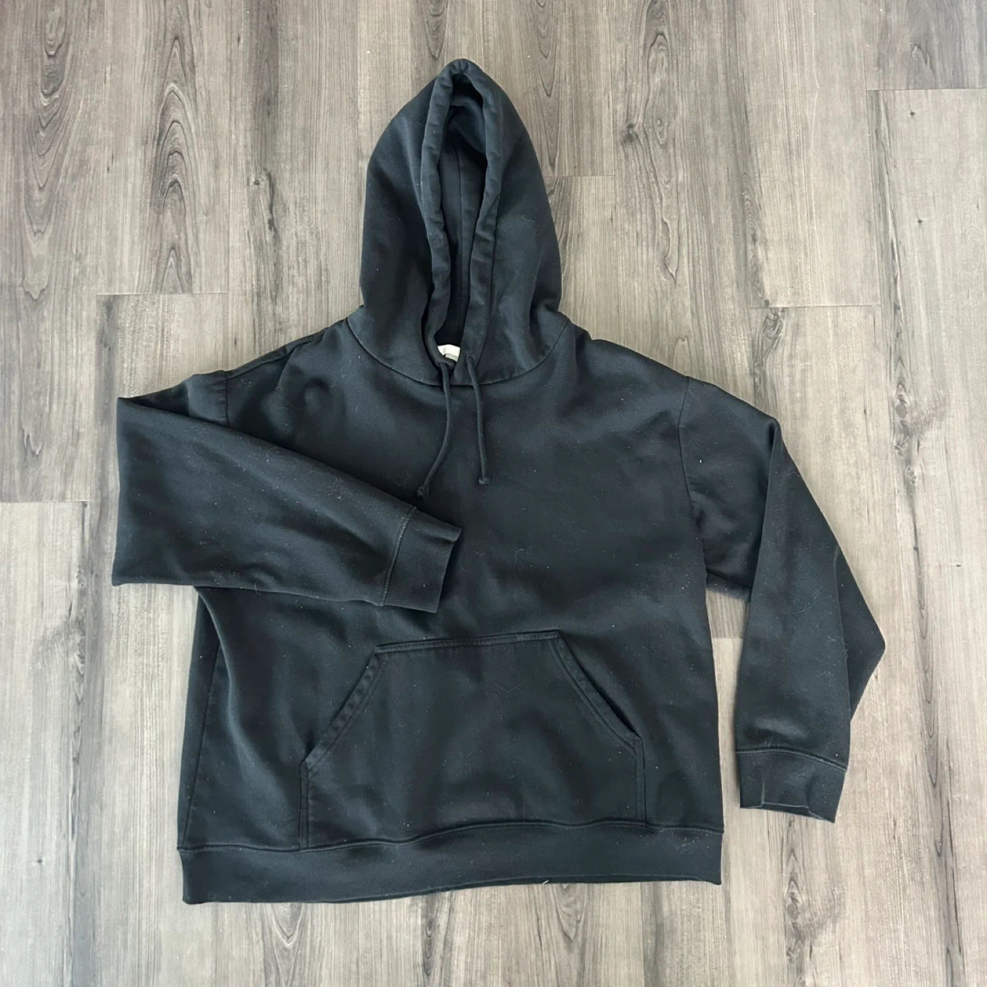Selling a cozy black hoodie. It's in great condition and perfect for layering or just lounging around. It has a classic design with a hood and a front pocket. A great addition to your wardrobe!