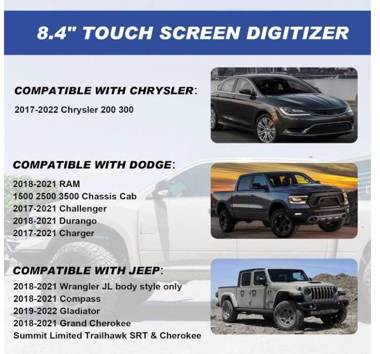 With the growth of time, the screen will show symptoms such as ghost touches, screen separation and slow response. You can choose this Uconnect screen with a high quality LCD monitor for improved stability and longevity production. The upgraded touch screen does not shift to the left.