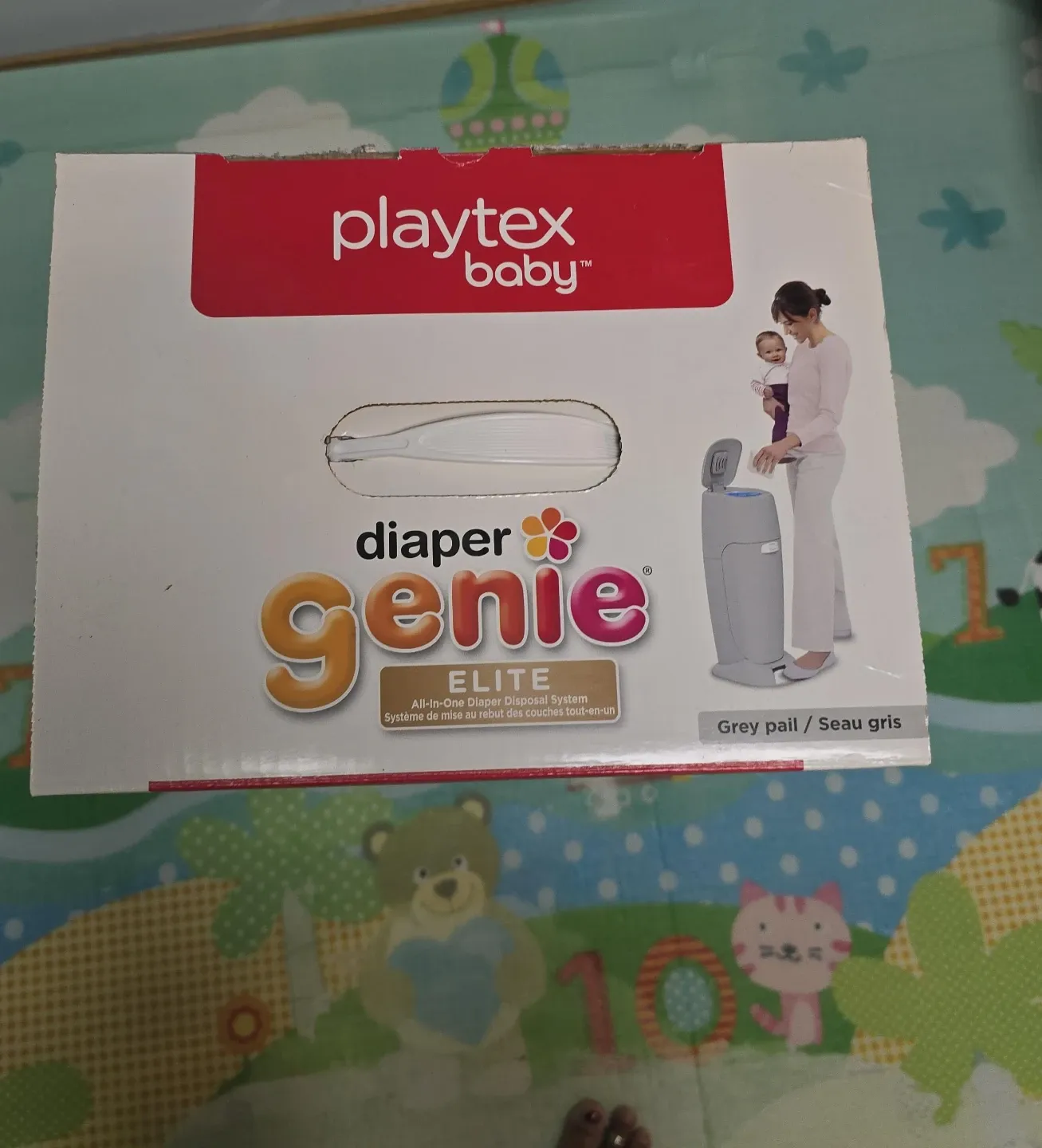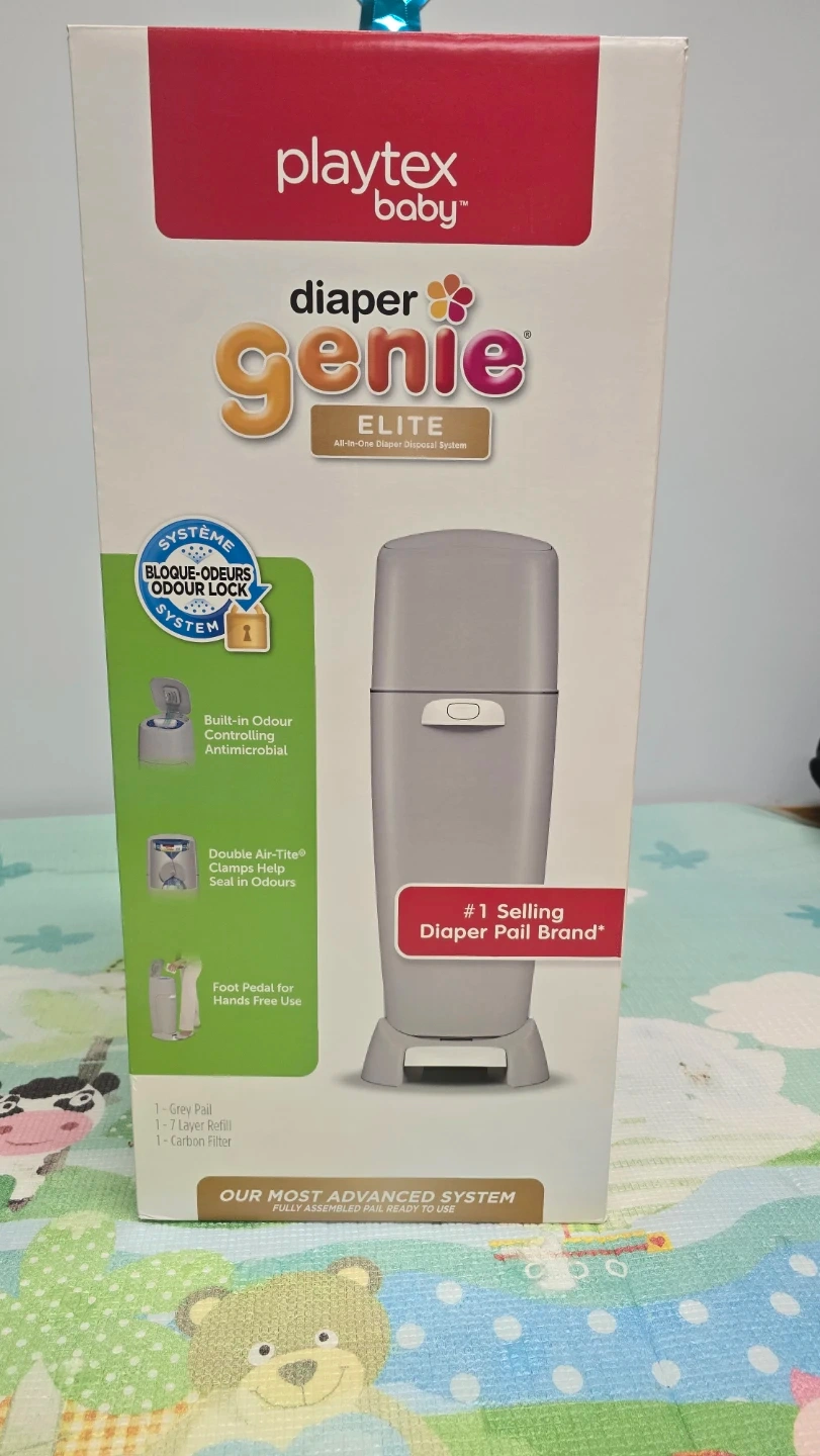 Selling a Playtex Baby Diaper Genie Elite All-in-One Diaper Disposal System. It's a #1 selling diaper pail brand! It features a foot pedal for hands-free use and a built-in odour controlling antimicrobial system. The box is included