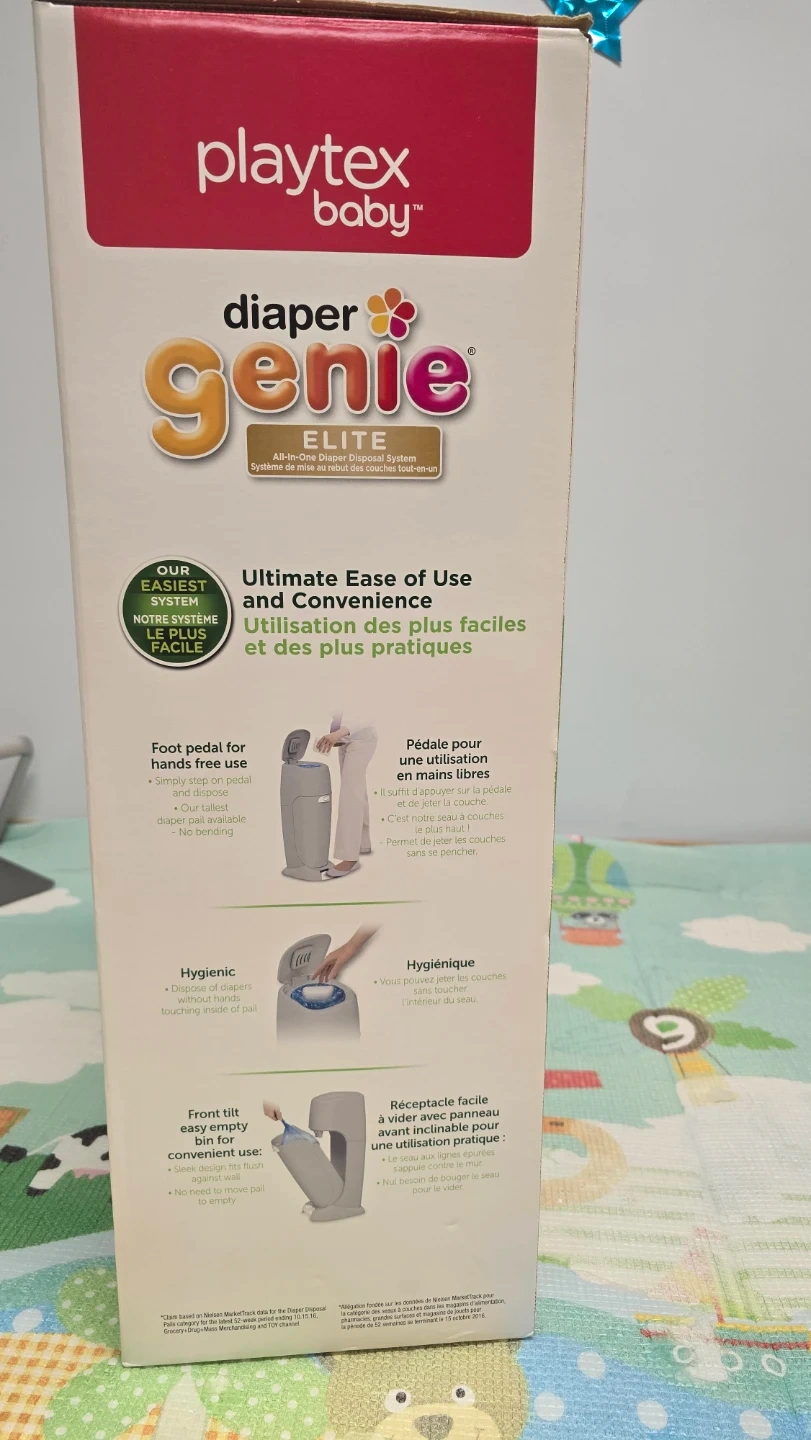 Selling a Playtex Baby Diaper Genie Elite All-in-One Diaper Disposal System. It's a #1 selling diaper pail brand! It features a foot pedal for hands-free use and a built-in odour controlling antimicrobial system. The box is included