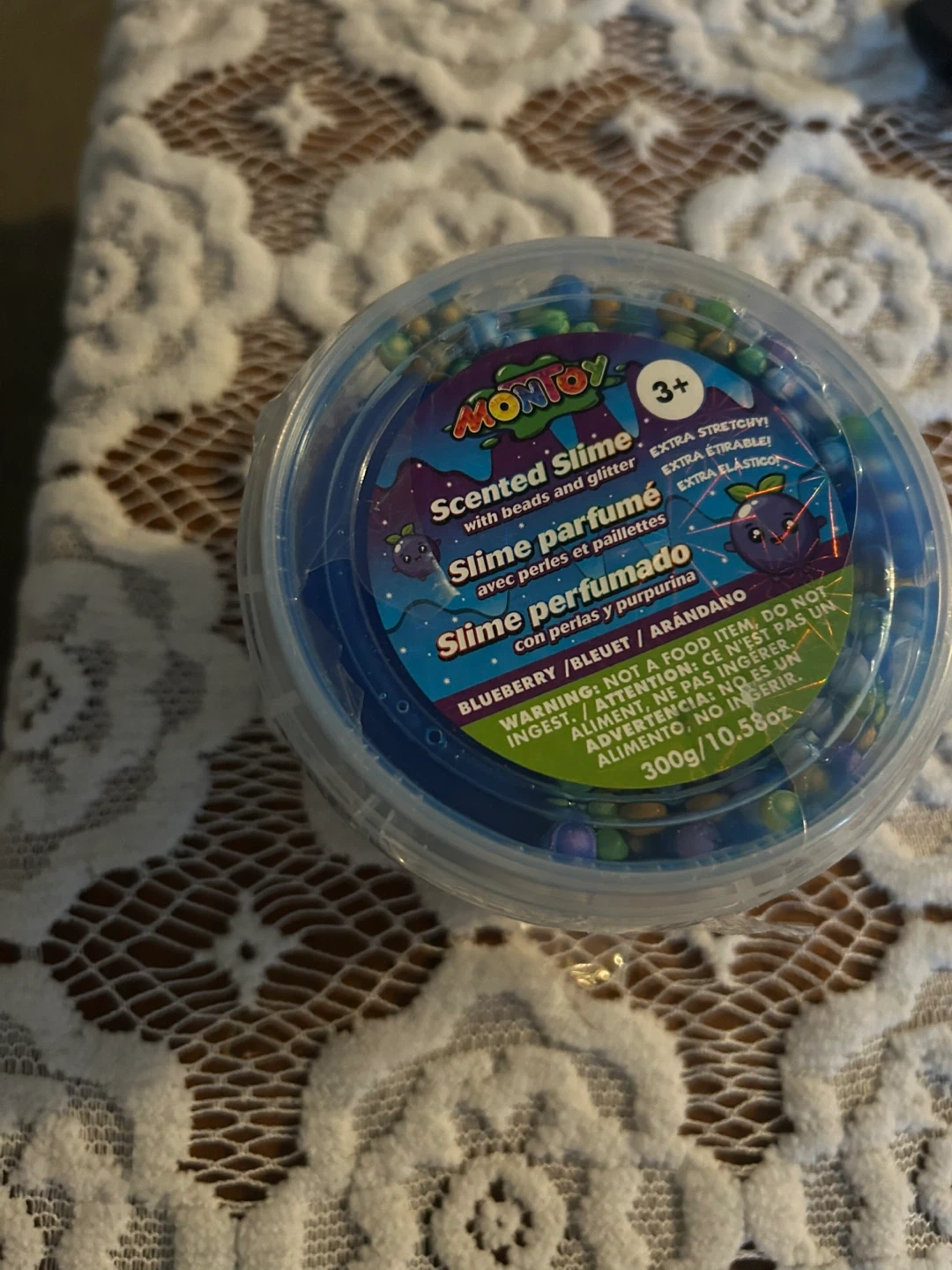 Selling a MomToy scented slime with beads and glitter! It's a blueberry scented slime, extra stretchy and comes in a 300g/10.5oz container. Recommended for ages 3+