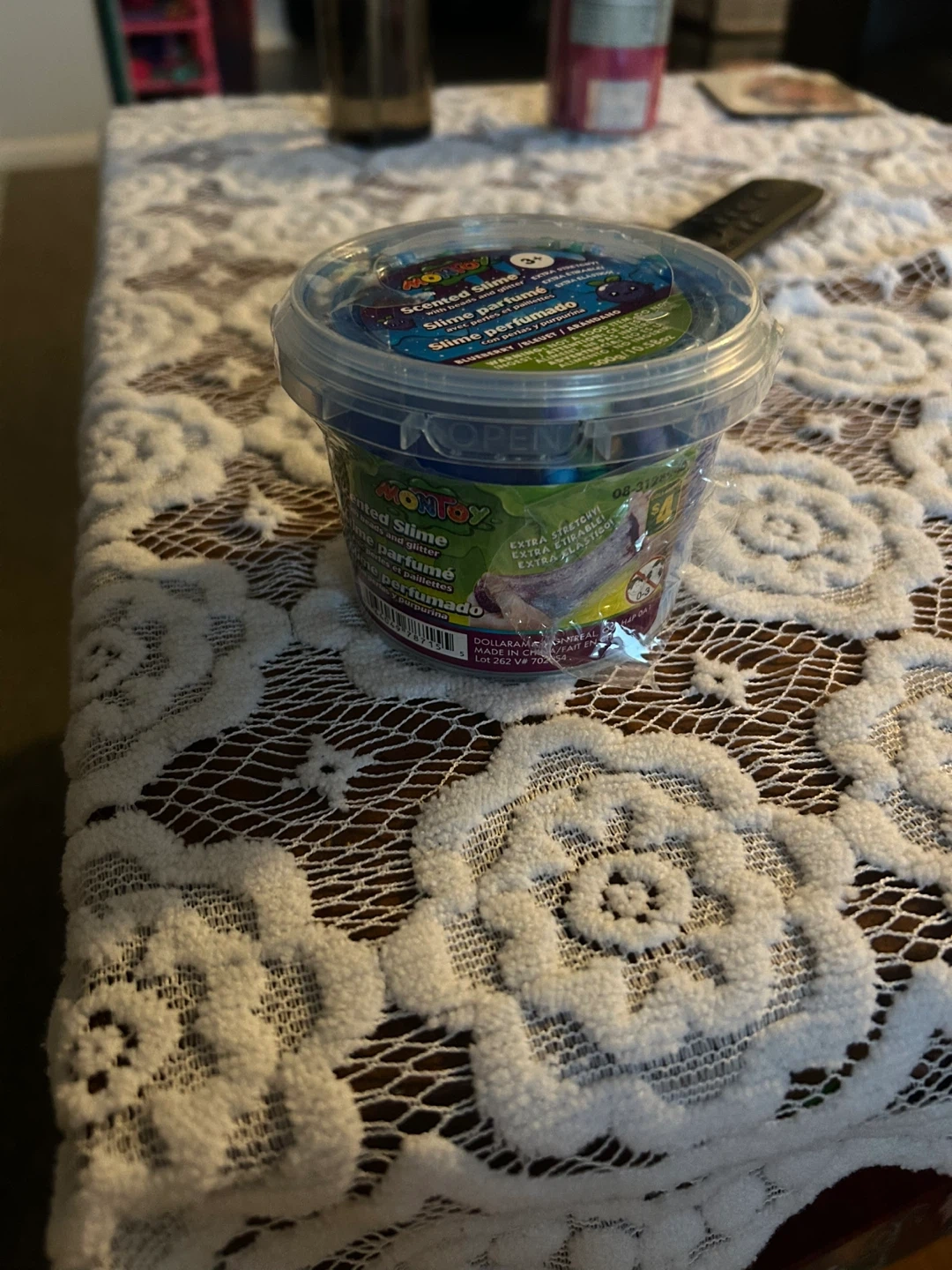 Selling a MomToy scented slime with beads and glitter! It's a blueberry scented slime, extra stretchy and comes in a 300g/10.5oz container. Recommended for ages 3+