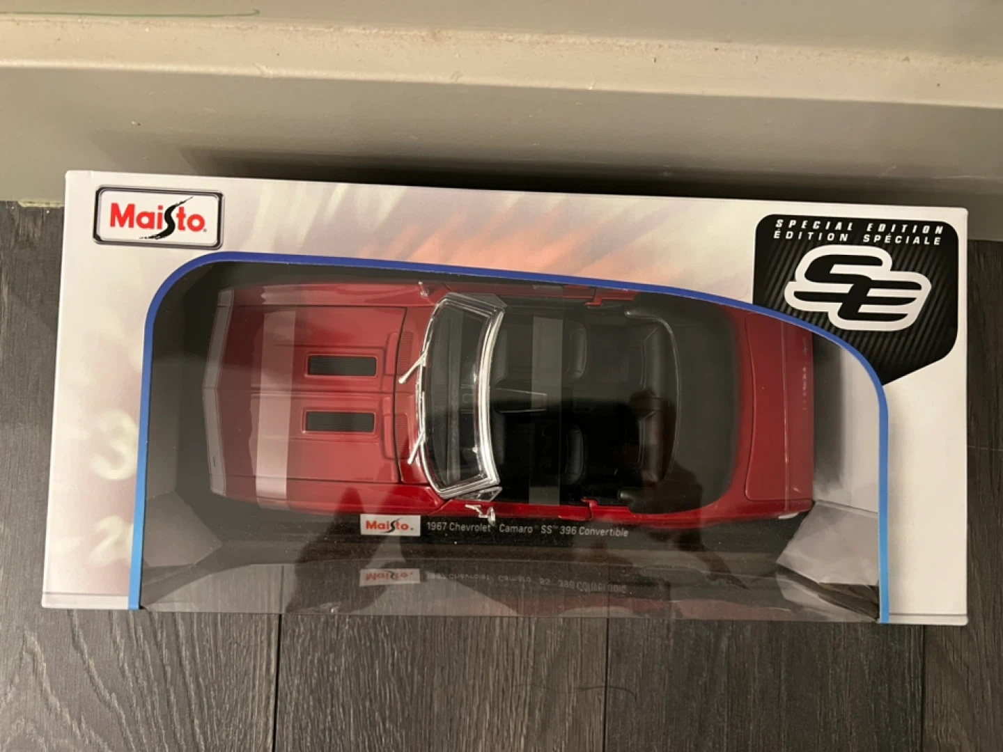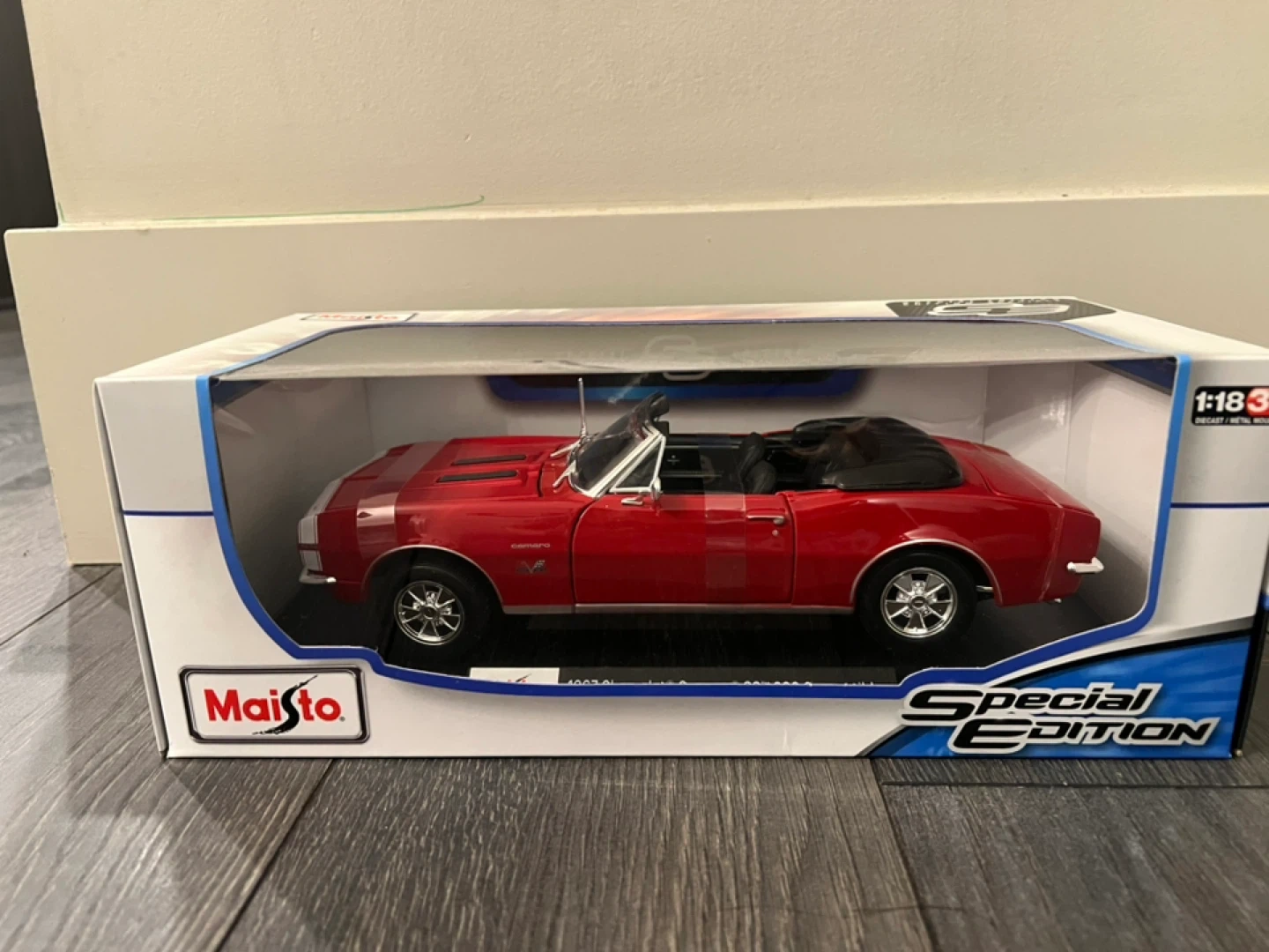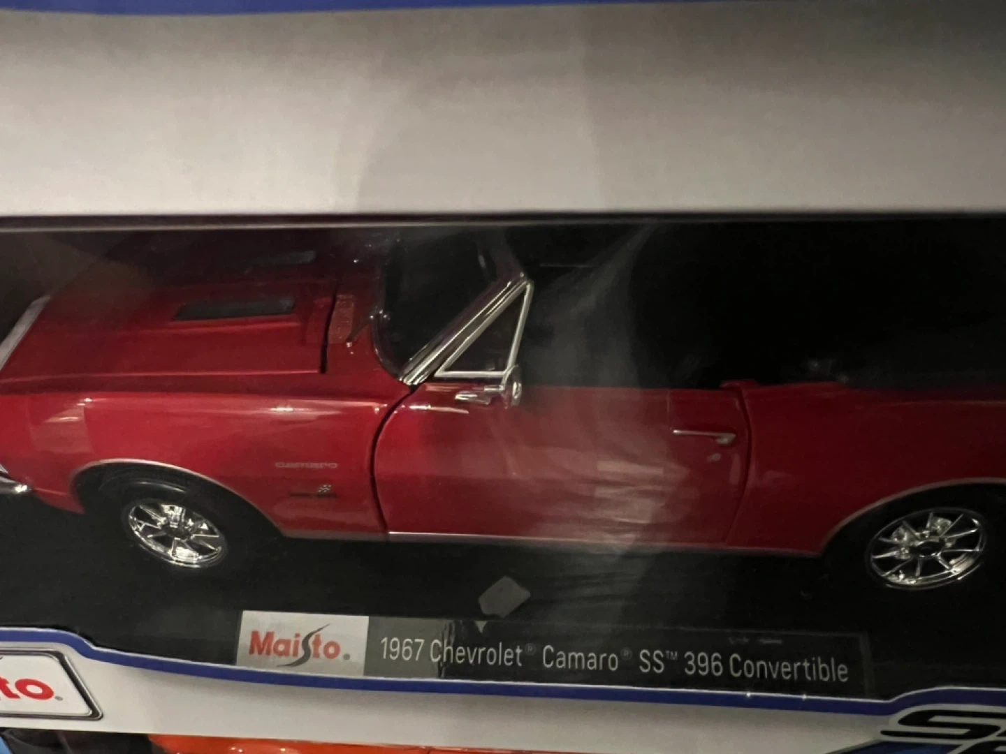 Selling a Maisto 1967 Chevrolet Camaro SS 396 Convertible diecast model car. It's in the 1:18 scale and comes in its original box. The car is a beautiful red colour and is a special edition!