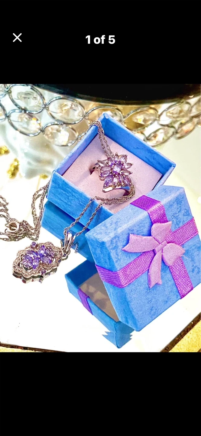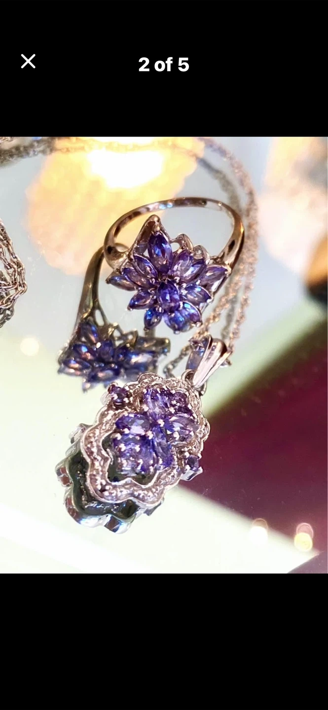 💜Selling a beautiful Stauer tanzanite ring and necklace set! The ring and pendant are both flower-shaped with many tanzanite stones set in silver-tone metal. Perfect for adding a touch of elegance to any outfit
