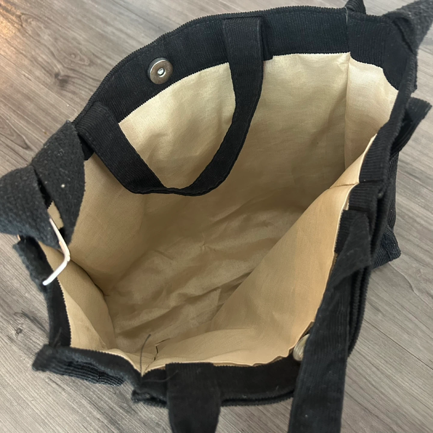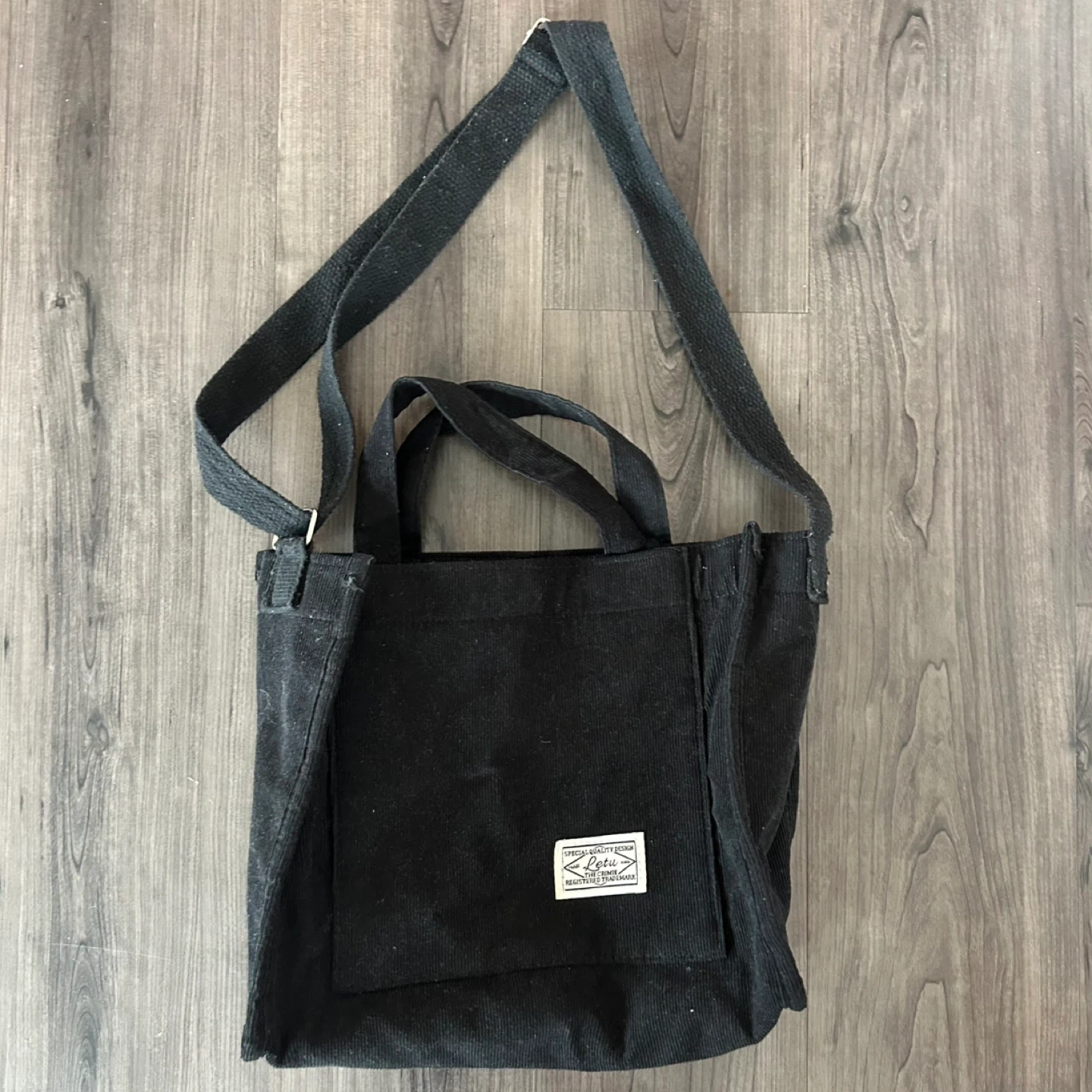 Selling a Leter black corduroy tote bag. It's in great condition and perfect for carrying books or groceries. This stylish and sturdy bag is ready for a new owner!