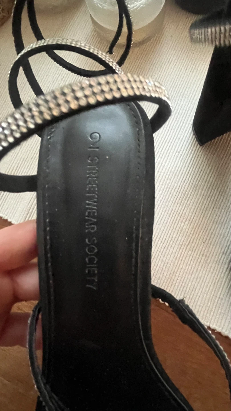 These black heels from On Streetwear Society are perfect for a night out! They feature a unique spiral design with rhinestone detailing. They are in great condition and ready for a new owner!