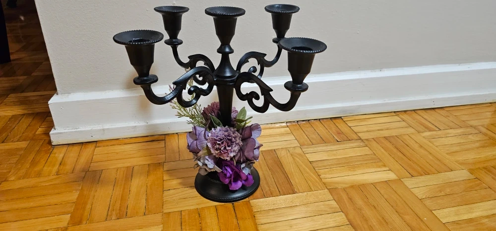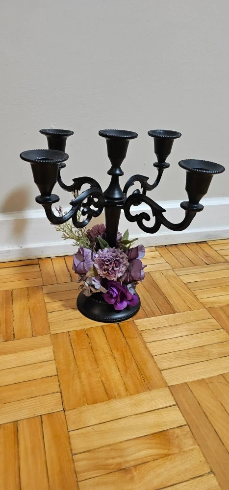 Selling a black metal candelabra! It's in great shape and comes with some lovely purple floral decorations at the base. It holds five candles and would make a beautiful centrepiece for any table