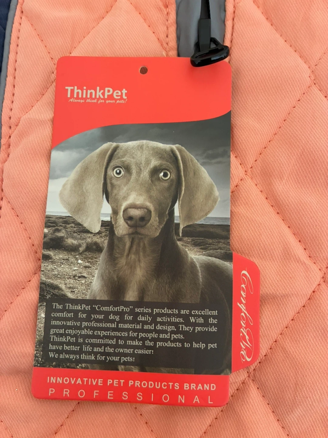 This is a ThinkPet ComfortPro series dog coat. It's designed for daily activities with innovative professional material and design. The coat is a mix of peach and blue. It's in great condition and ready for your furry friend!