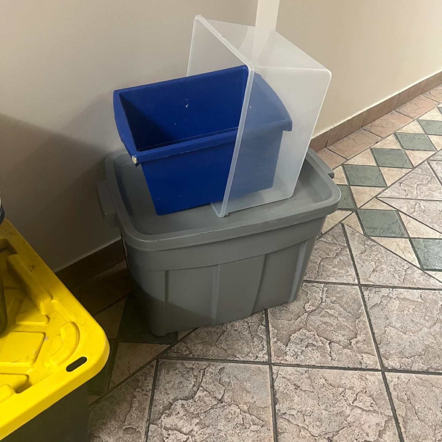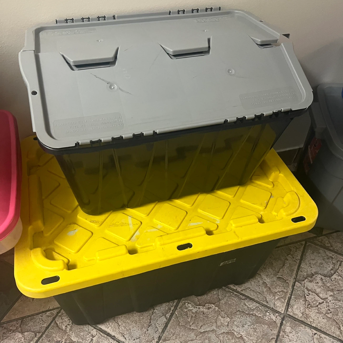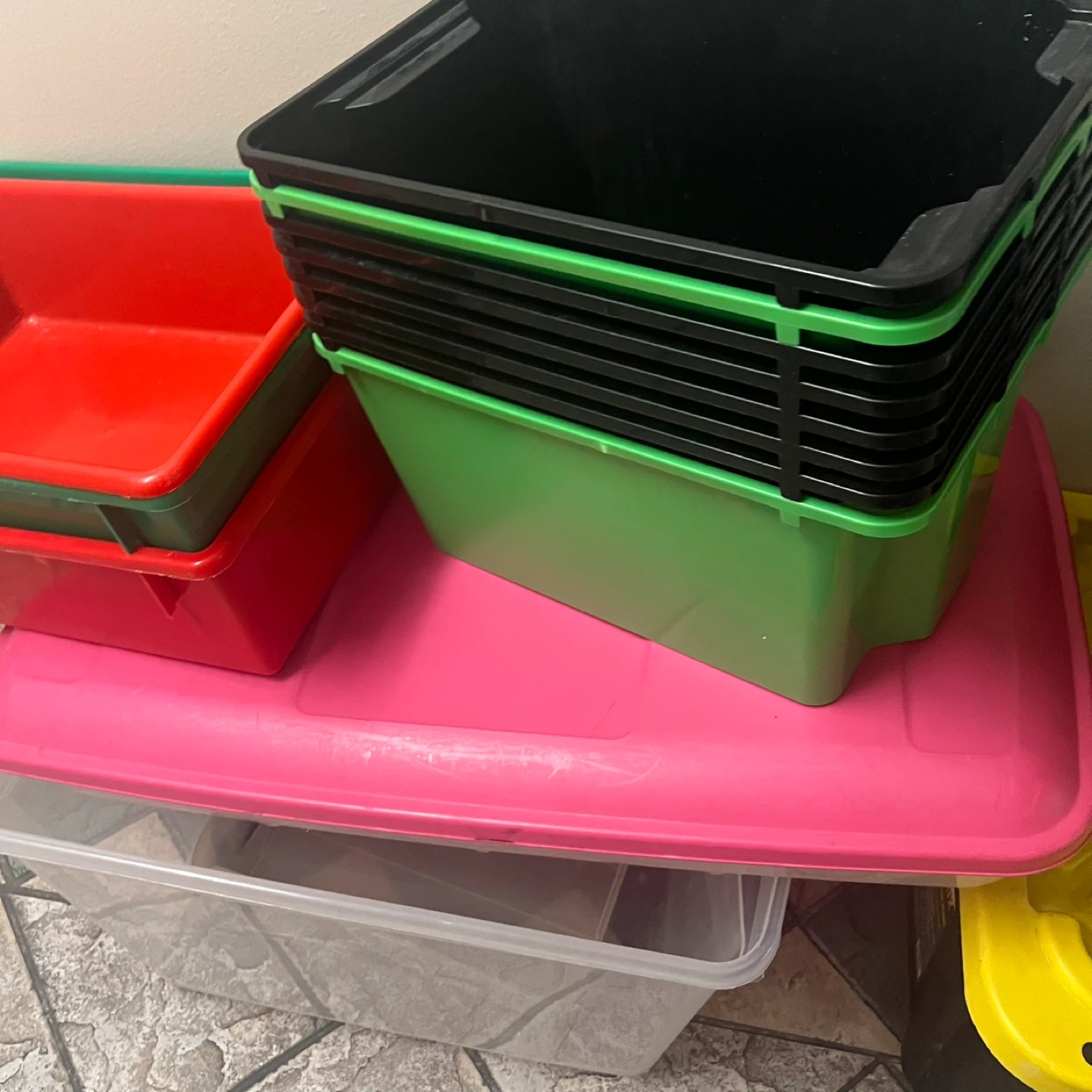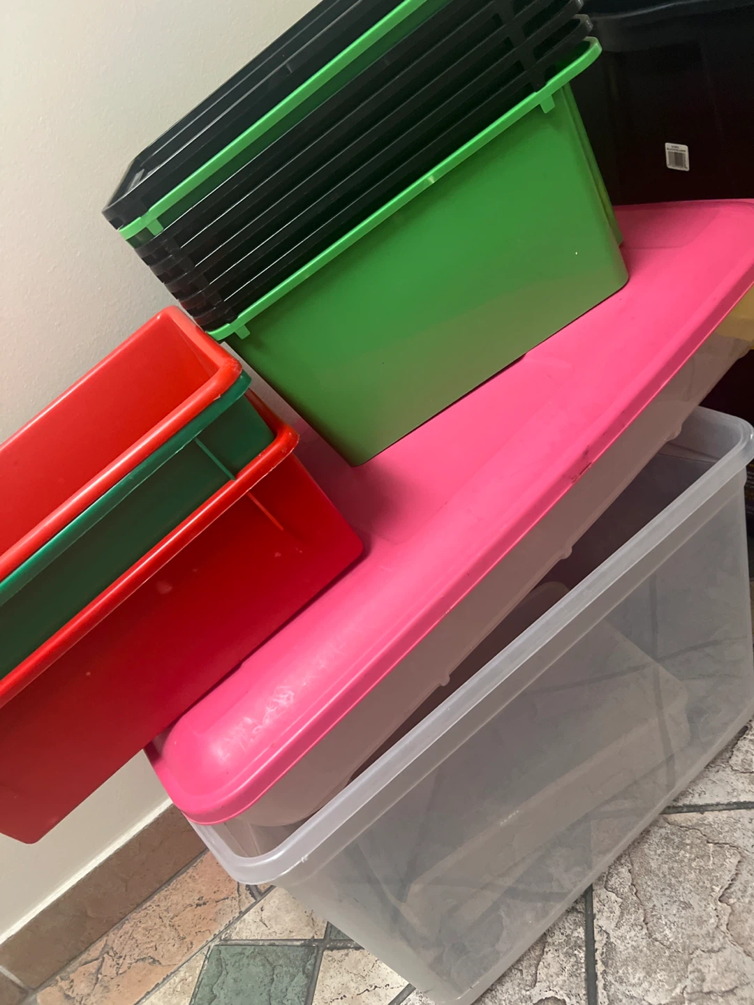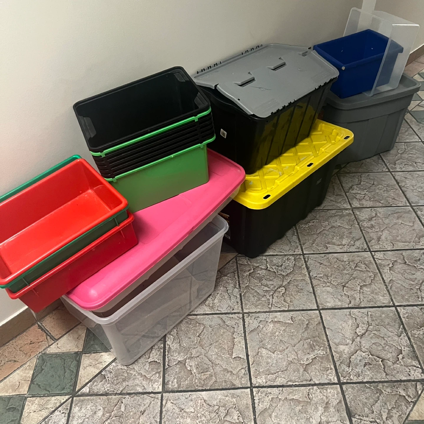 Over 25 pieces and extras Selling a collection of assorted storage bins and totes in various colours. Great for organizing your home or garage!