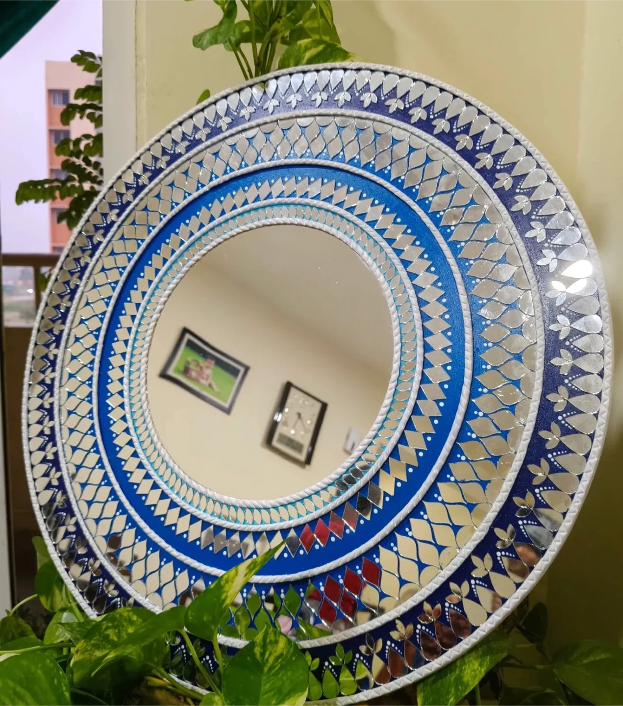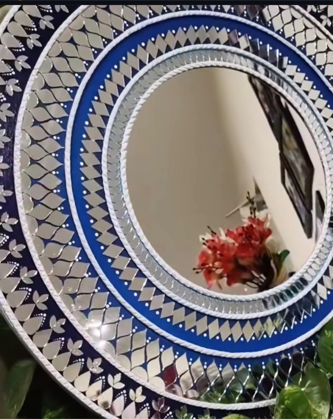 Add a touch of elegance to your home with this beautiful round decorative wall mirror! The intricate blue and silver design makes it a stunning focal point for any room. It's in great condition and ready to brighten up your space