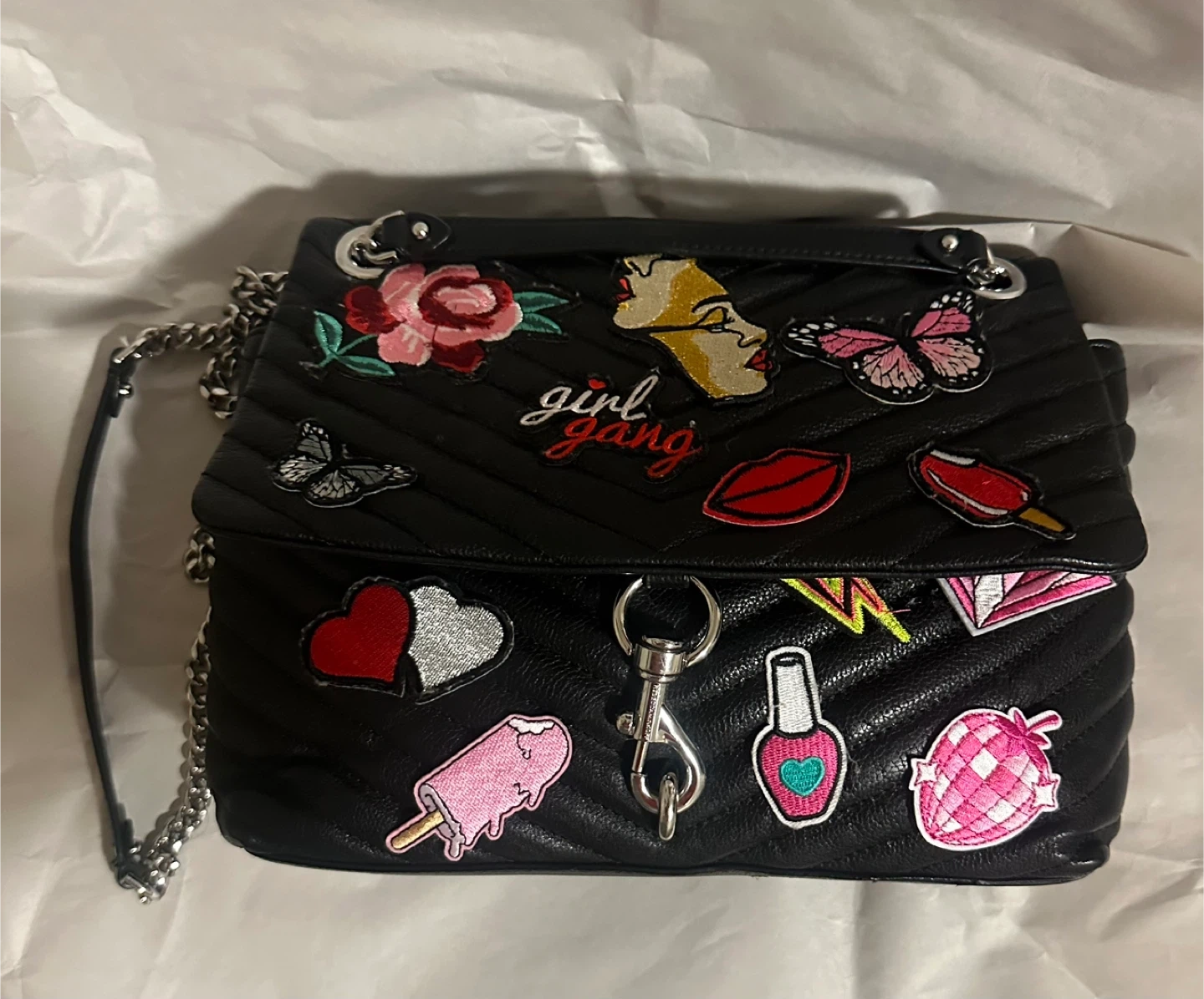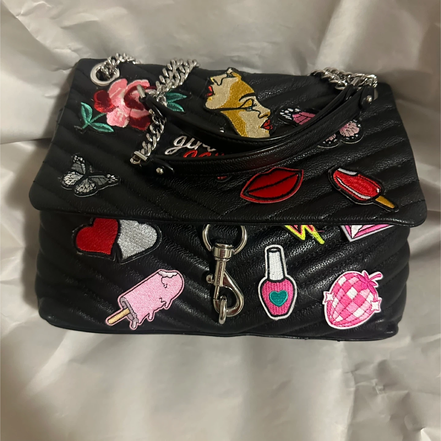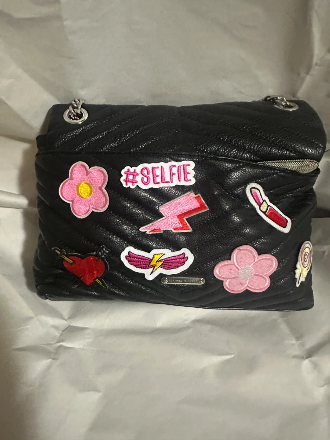 Selling a Rebecca Minkoff shoulder bag in black leather! It has a chain strap and is decorated with colourful patches that were put on by self. The interior lining has two small red stains, please see pictures.