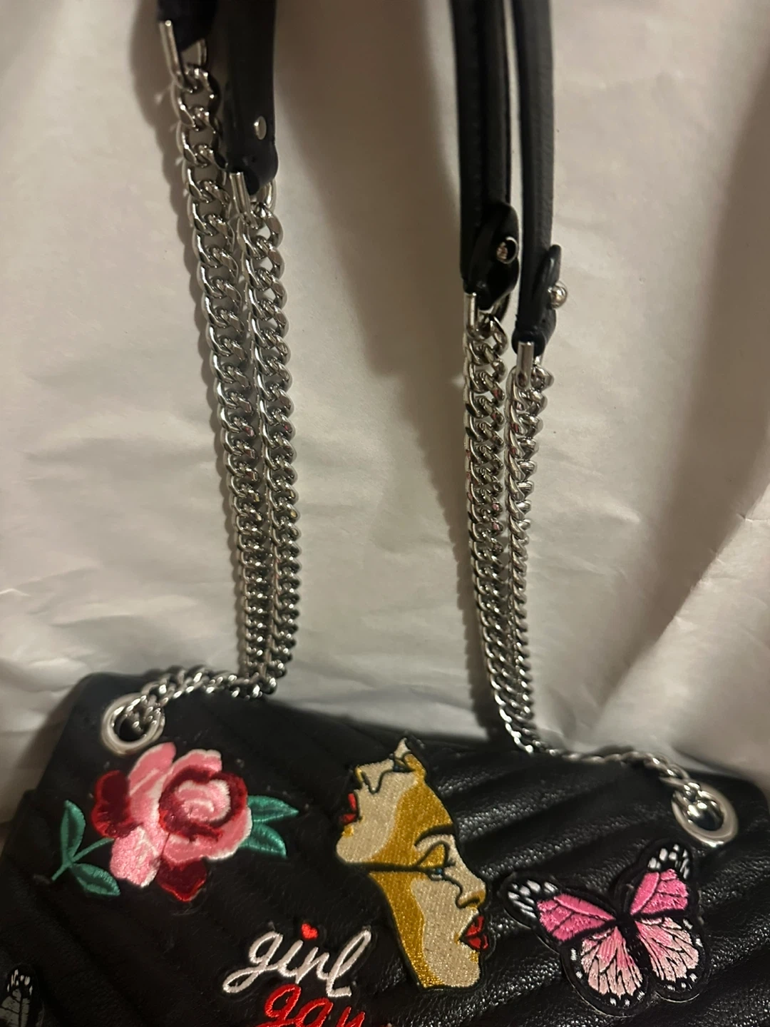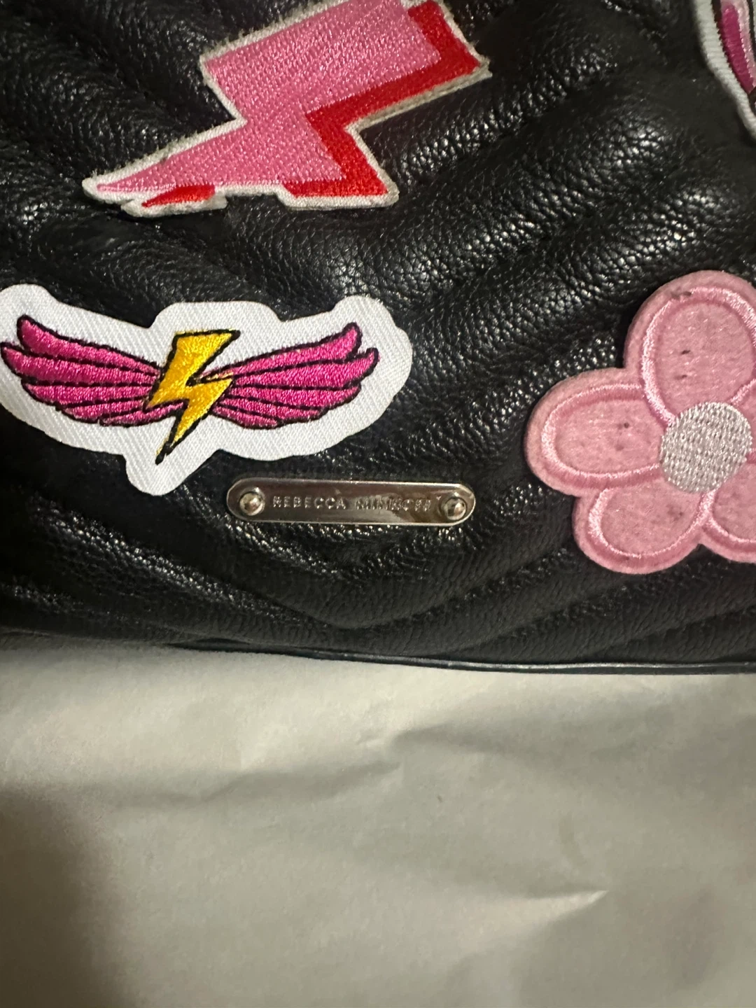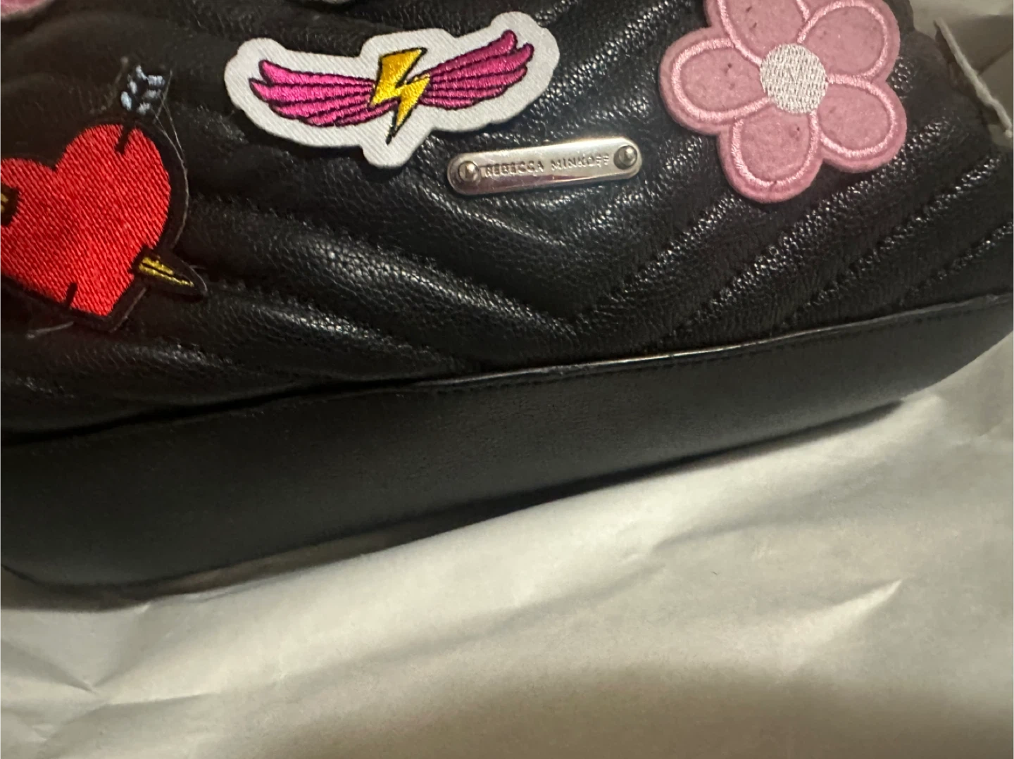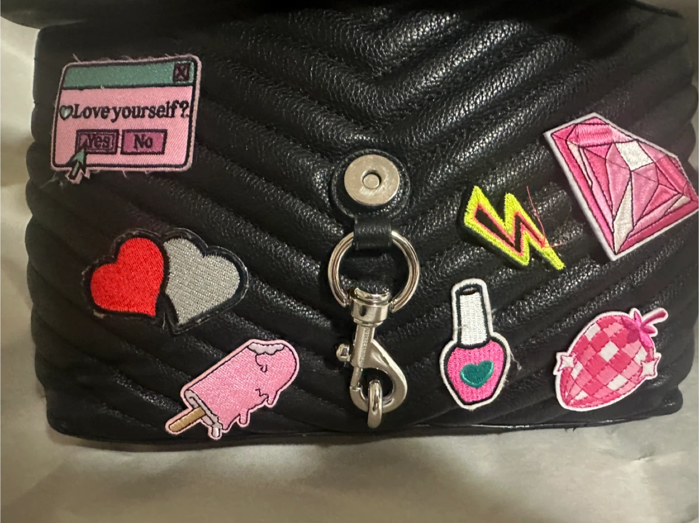 Selling a Rebecca Minkoff shoulder bag in black leather! It has a chain strap and is decorated with colourful patches that were put on by self. The interior lining has two small red stains, please see pictures.