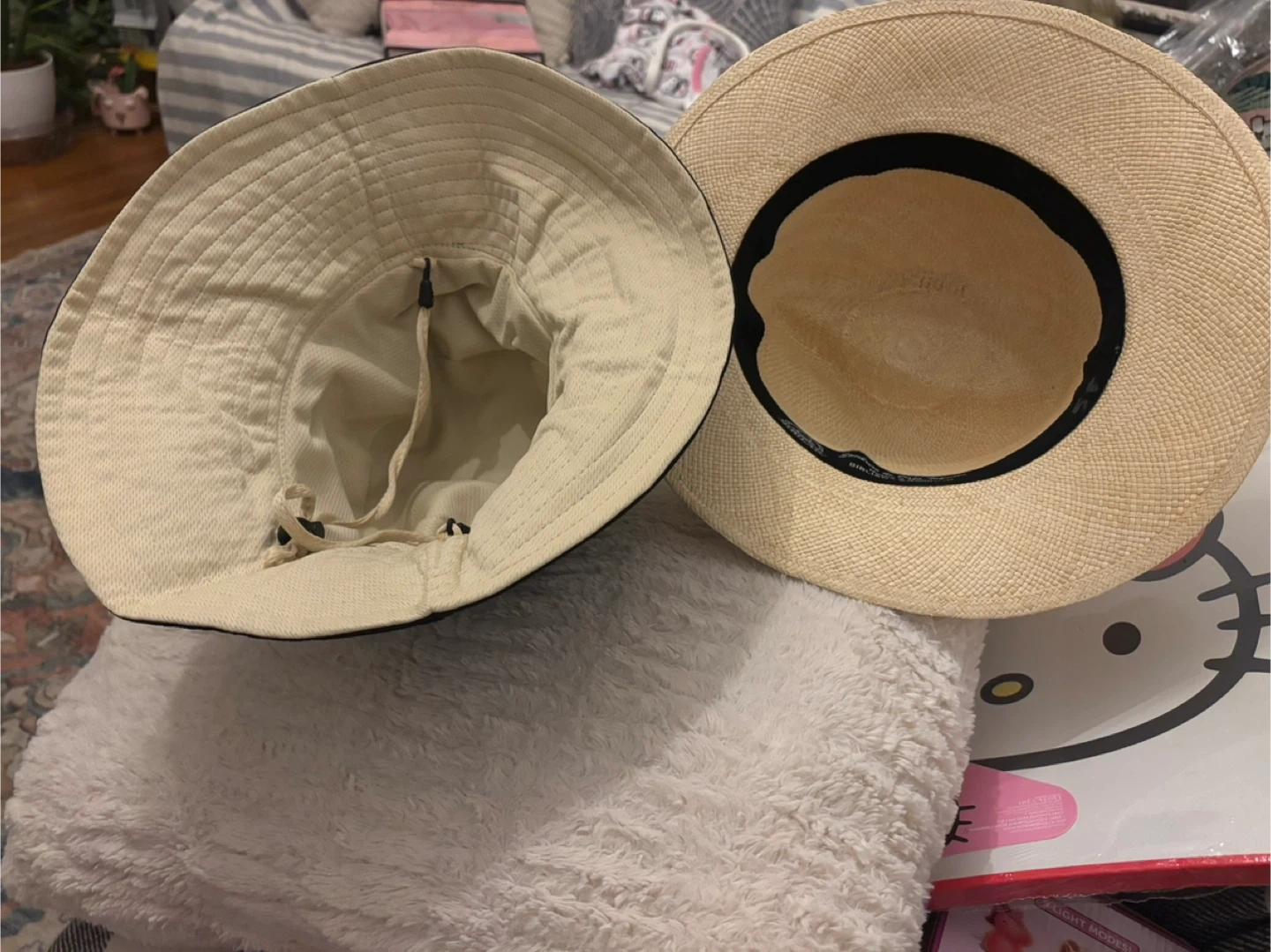 Selling two hats together! One is a black bucket hat, and the other is a beige straw fedora. Both are in good condition and ready for a new owner