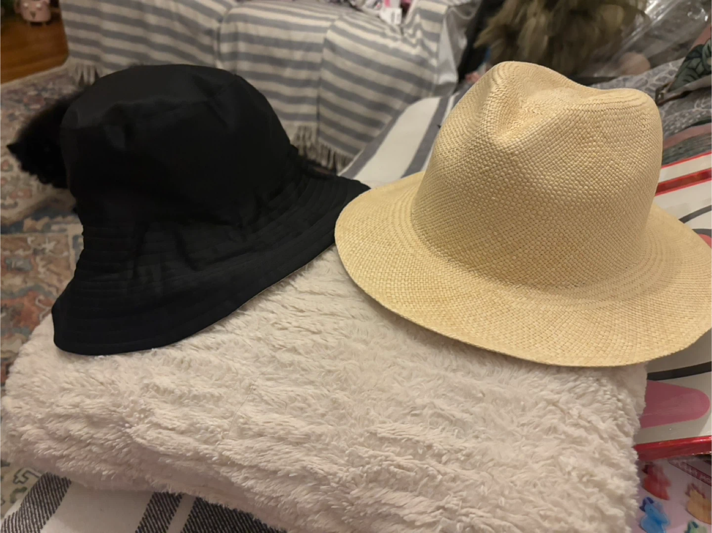 Selling two hats together! One is a black bucket hat, and the other is a beige straw fedora. Both are in good condition and ready for a new owner