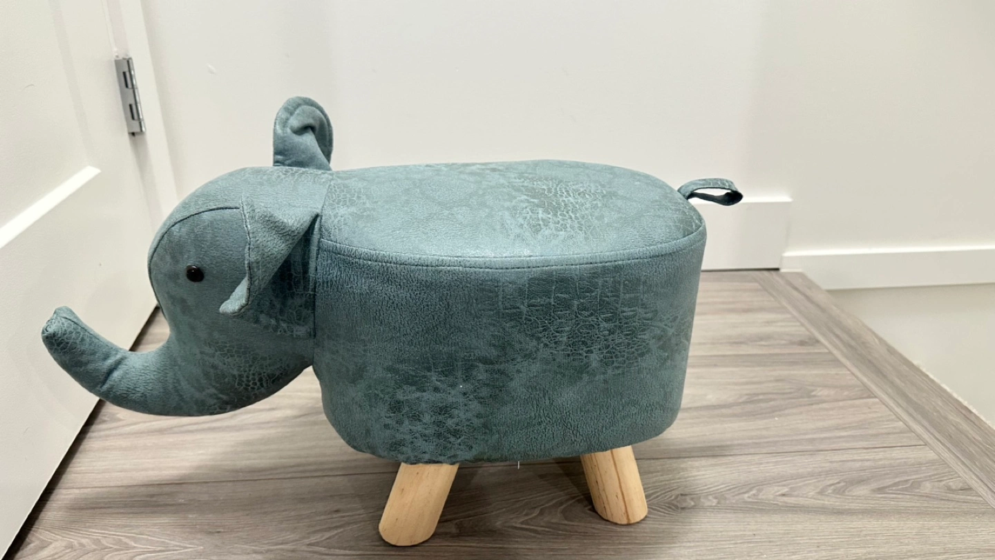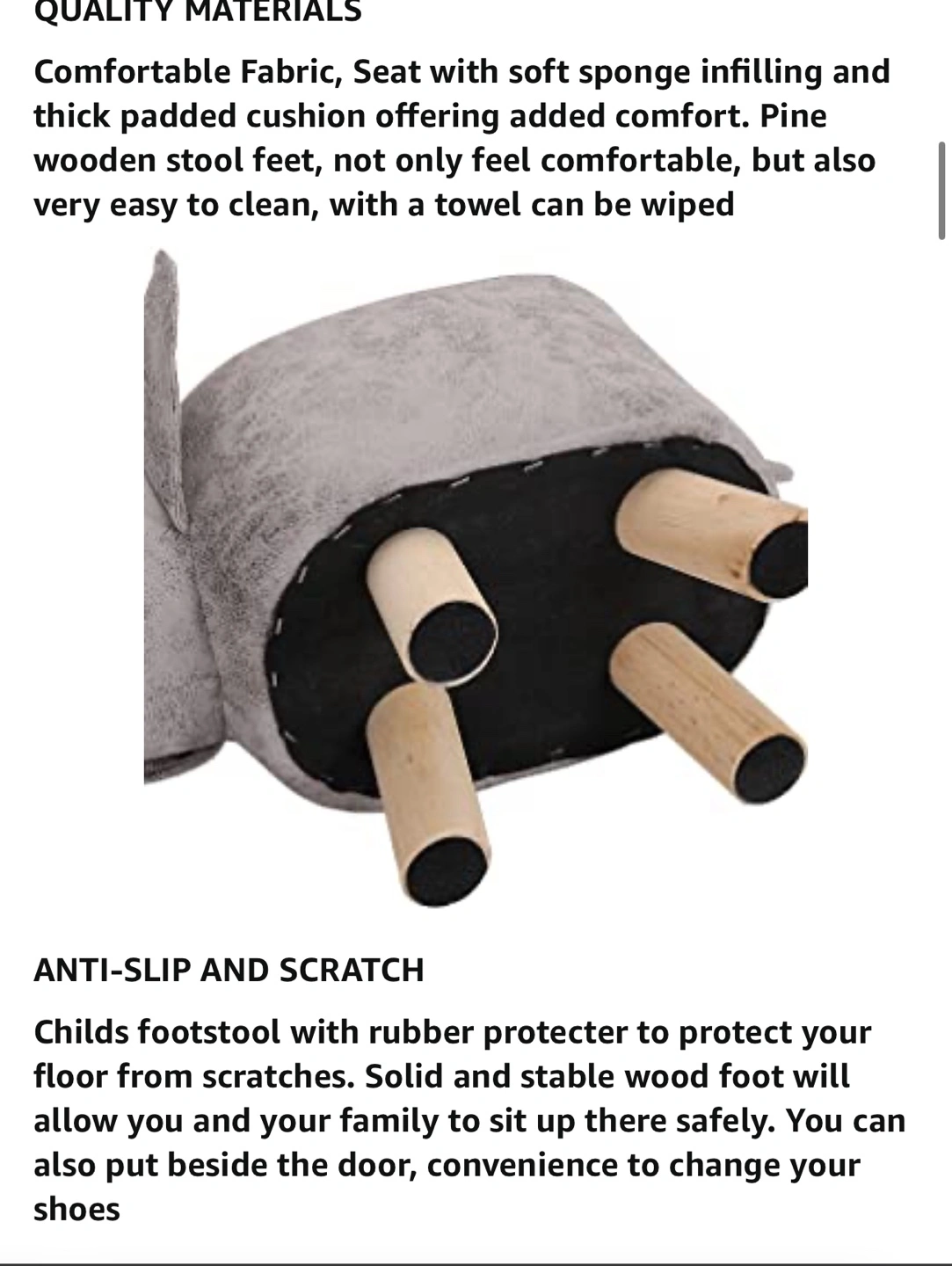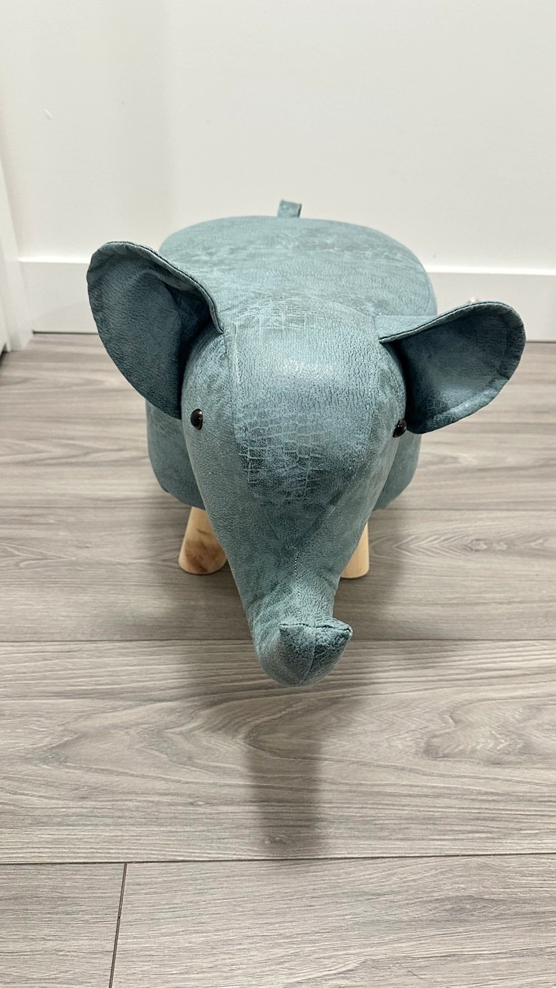 Cute elephant-shaped footstool. Soft padded cushion. Wooden legs. Perfect for kids' rooms or as extra seating.