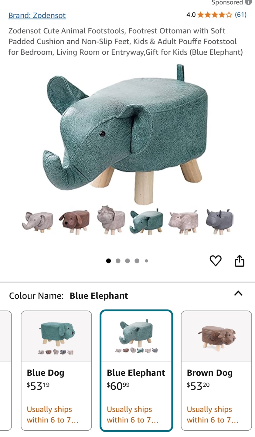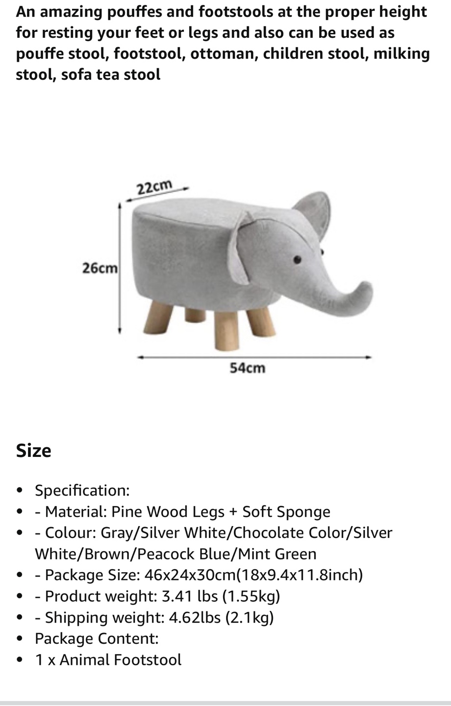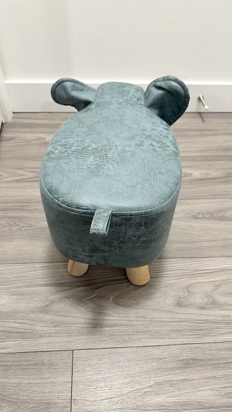 Cute elephant-shaped footstool. Soft padded cushion. Wooden legs. Perfect for kids' rooms or as extra seating.