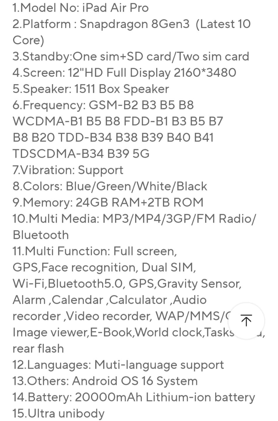 This is a 2026 iPad Air Pro tablet with a 12-inch display. It runs on Android 16 and features a Snapdragon 8Gen3 processor. The package includes the tablet, charger adapter, user manual, protection film, USB cable, clip, and pen. It has 24GB RAM and 2TB ROM and a 20000mAh battery.come in 4 colour-white.green.black.blue