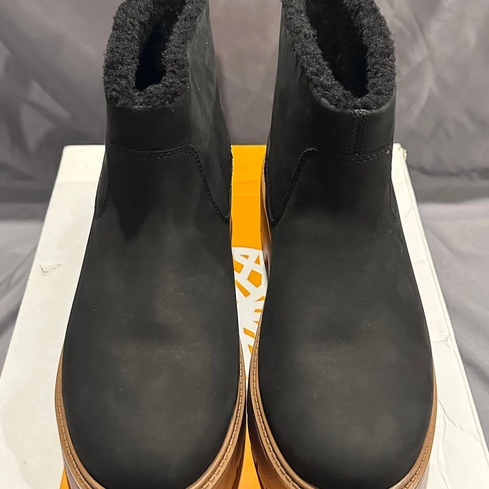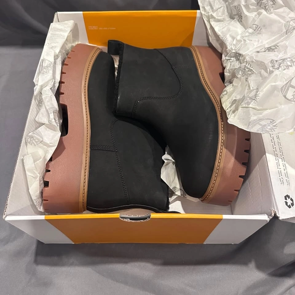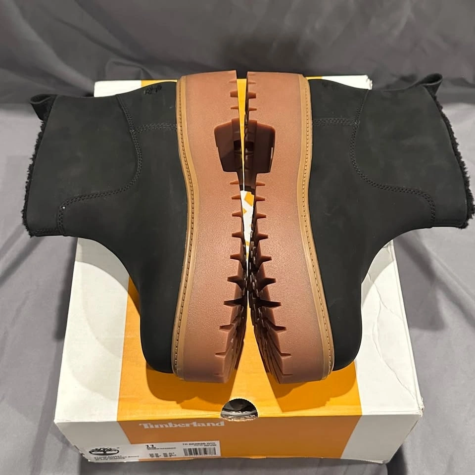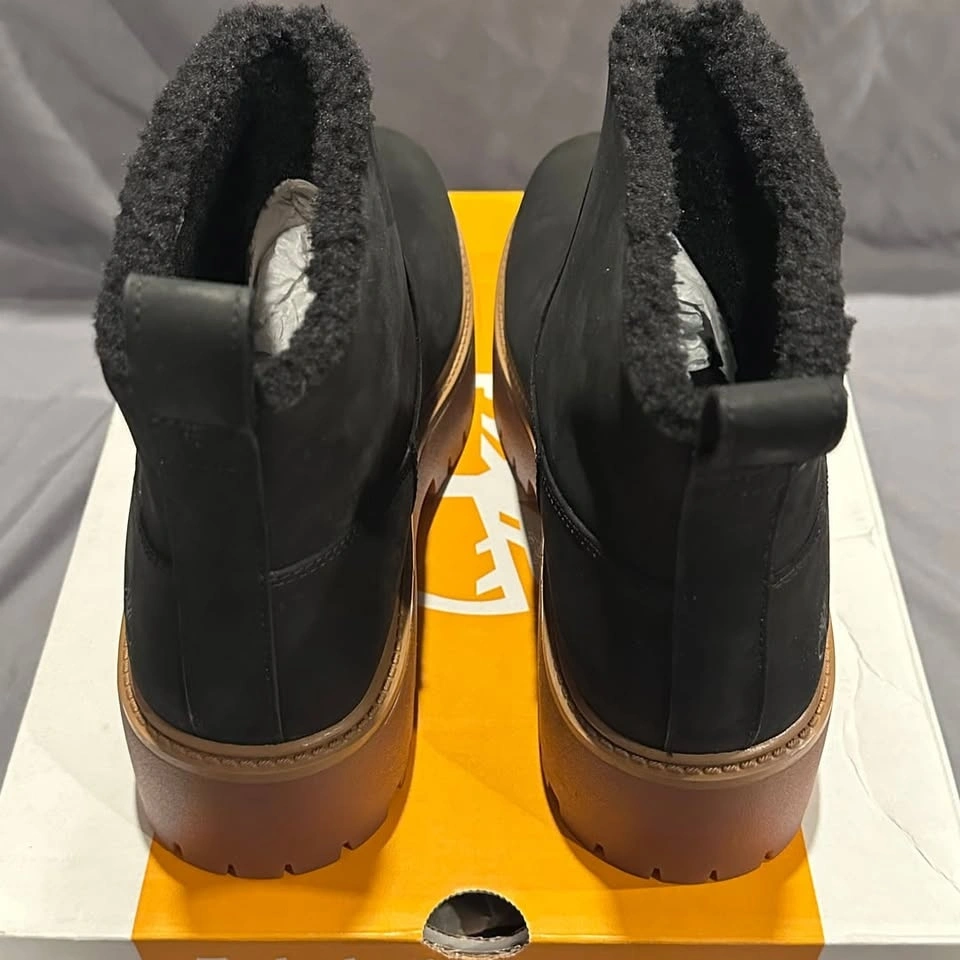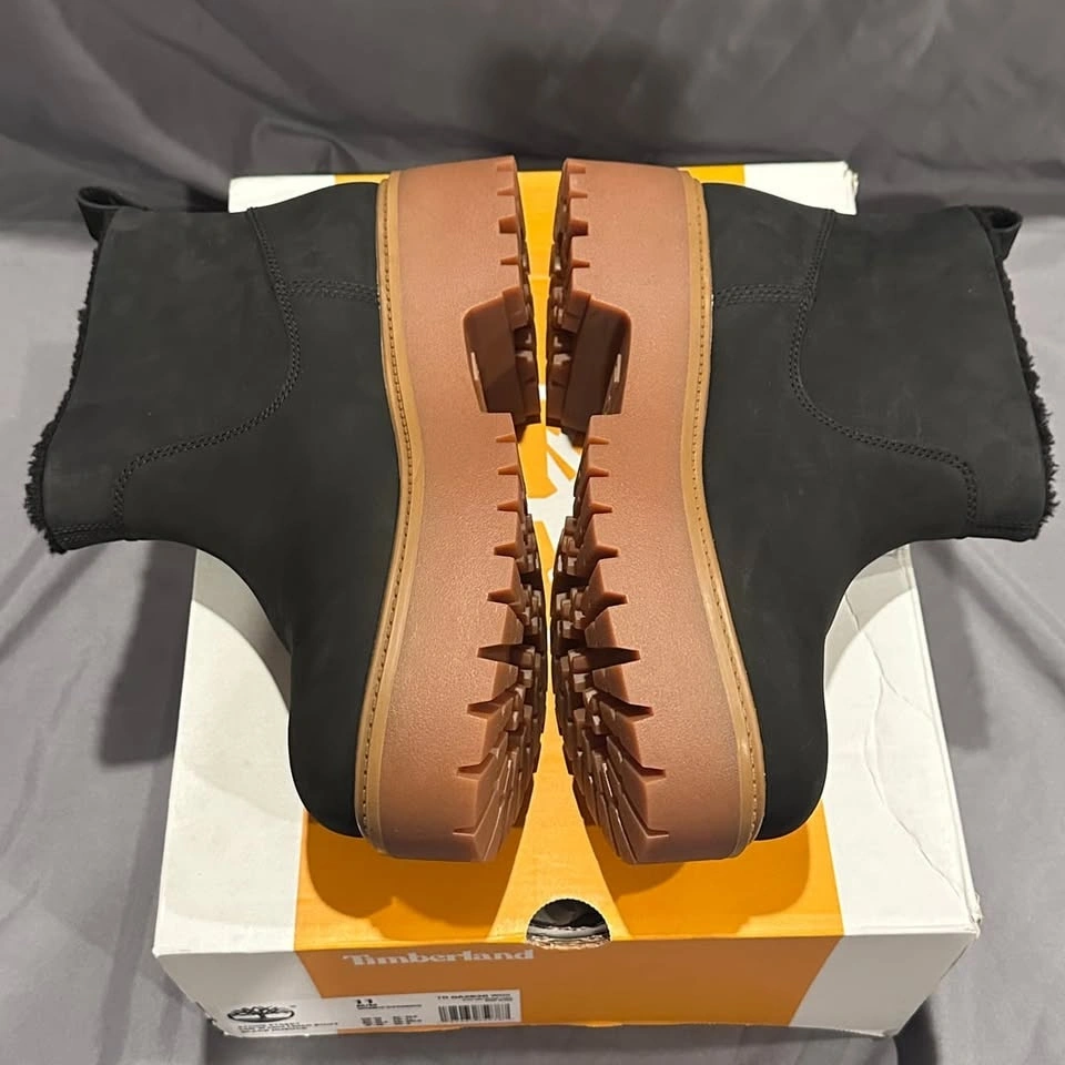 Timberland Stone Street Mid Warm Lined Boots, Women's Size 11. These stylish boots feature a durable black nubuck upper and a cozy warm lining, perfect for colder weather. The mid-cut design provides ample support, while the chunky lug sole offers excellent traction. Brand new in box, never worn. Ideal for casual wear or light outdoor activities.