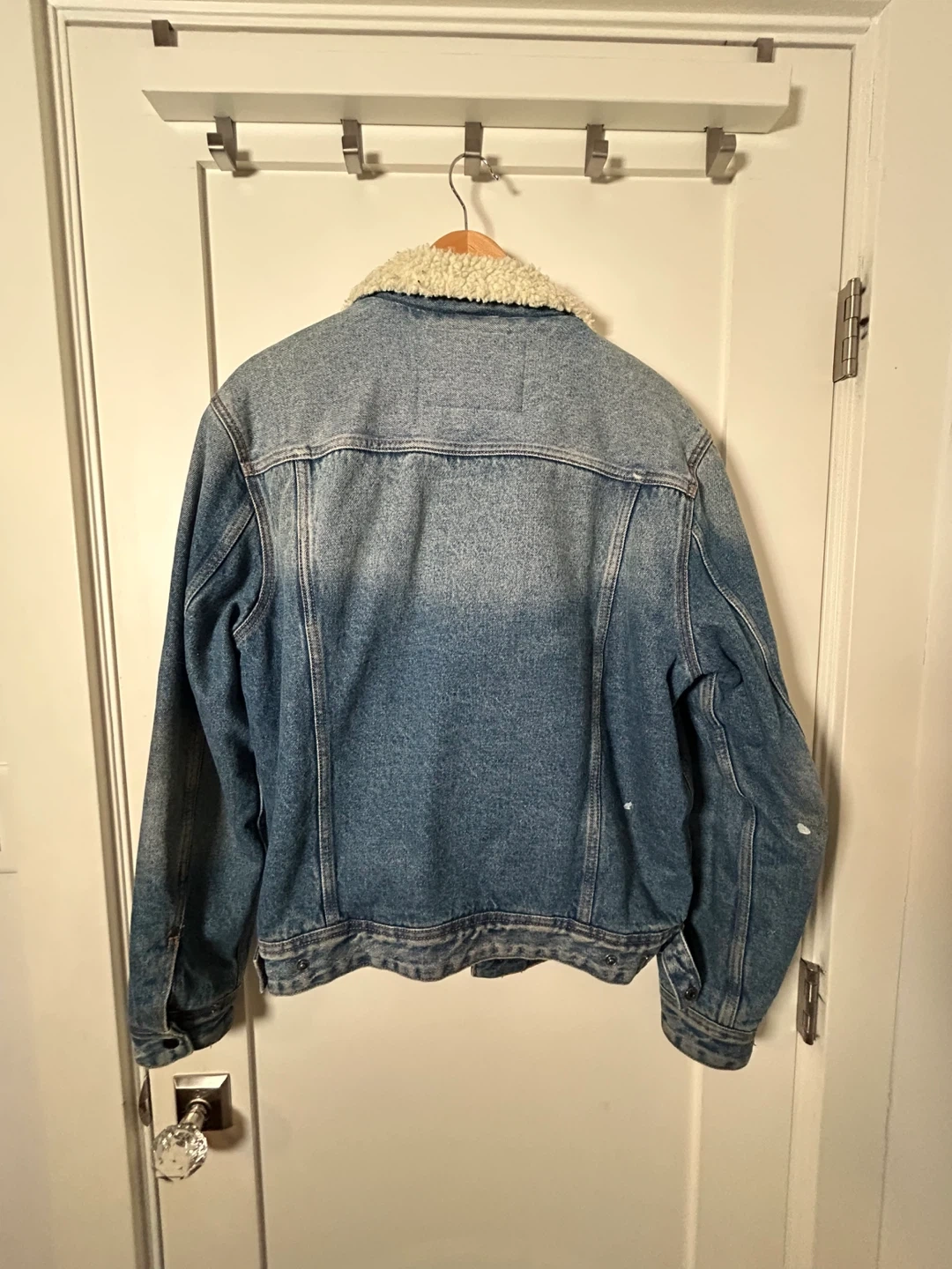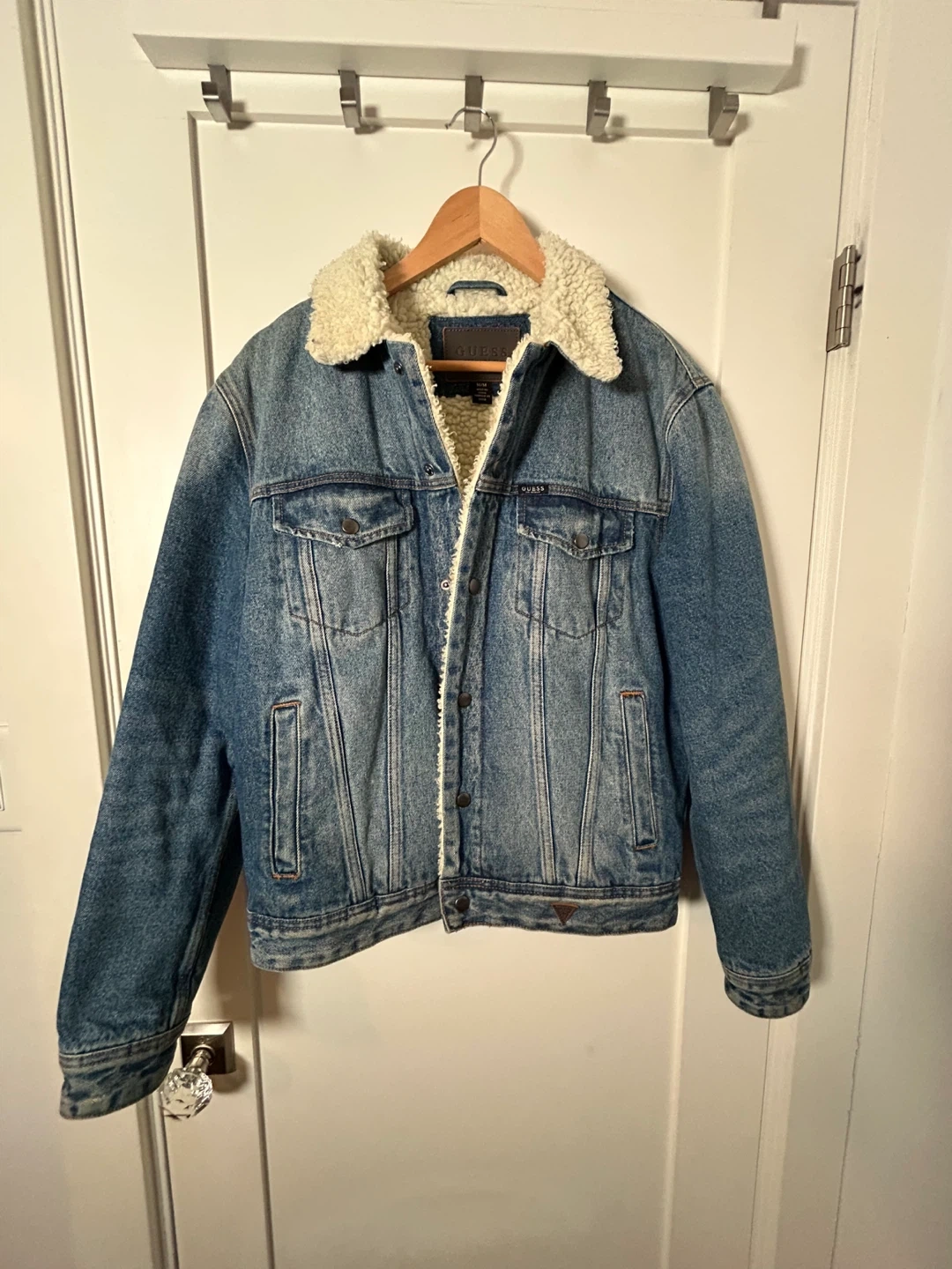Cozy Guess denim jacket with a warm sherpa lining! It's in great condition and perfect for cooler weather. Size is M. There are a few small paint splatters on the sleeve, as pictured.