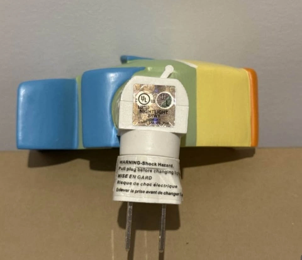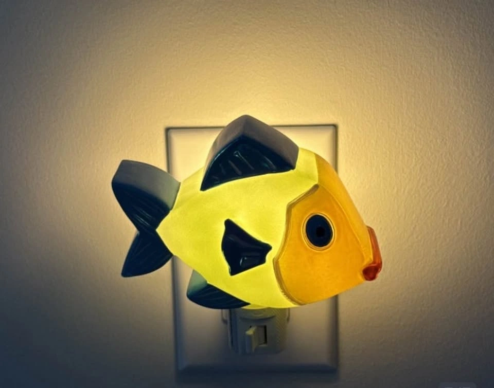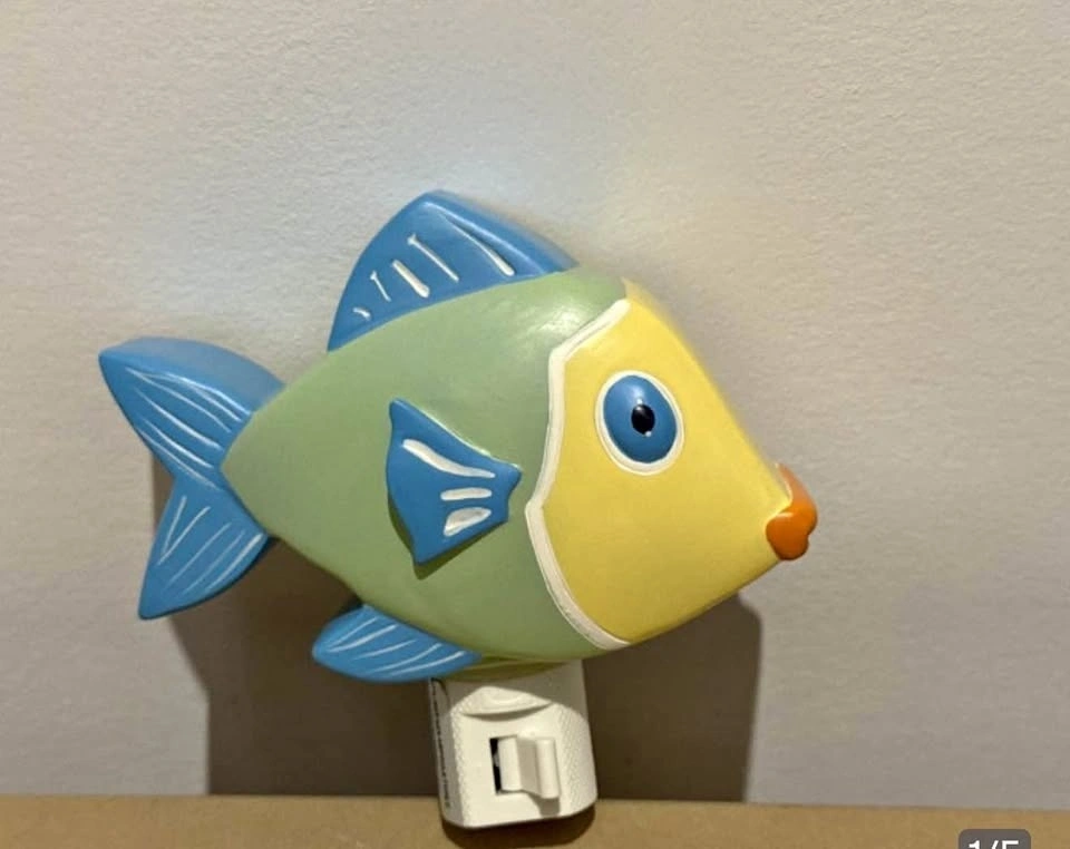 This adorable fish night light casts a warm and comforting glow, perfect for children's bedrooms or bathrooms, featuring a playful design with blue and yellow accents. This item is used and in very good condition.