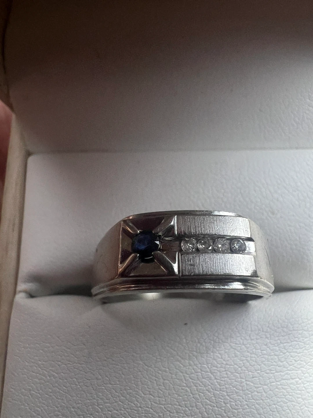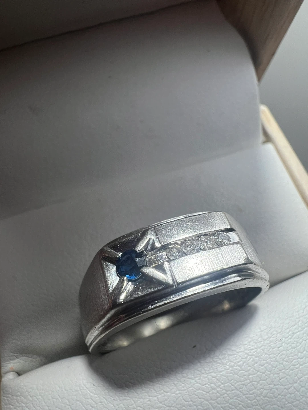Selling a 10K BMD men's ring. It features a blue sapphire and diamond accents. It's in great condition and ready for a new owner!