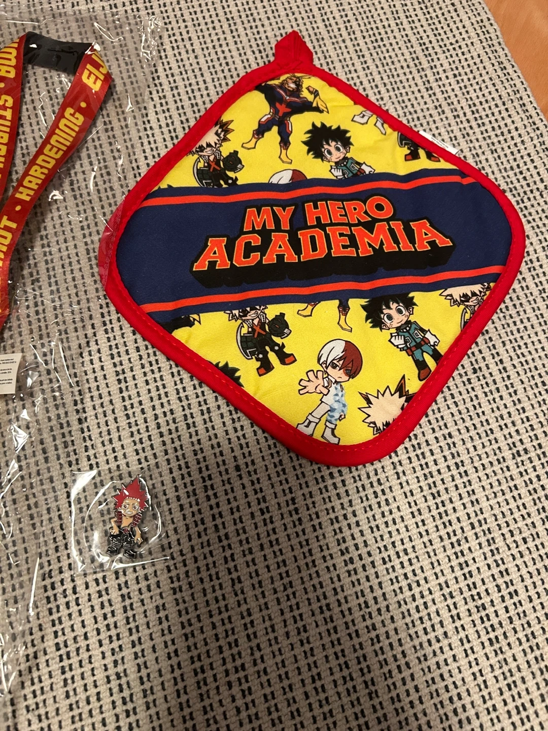 Selling a My Hero Academia gift set. Purchased as a mystery box at FanExpo 2025. Includes a hat (adjustable OSFM), oven mitt, pot holder, lanyard, keychain, and pin. Great for any fan of the series!