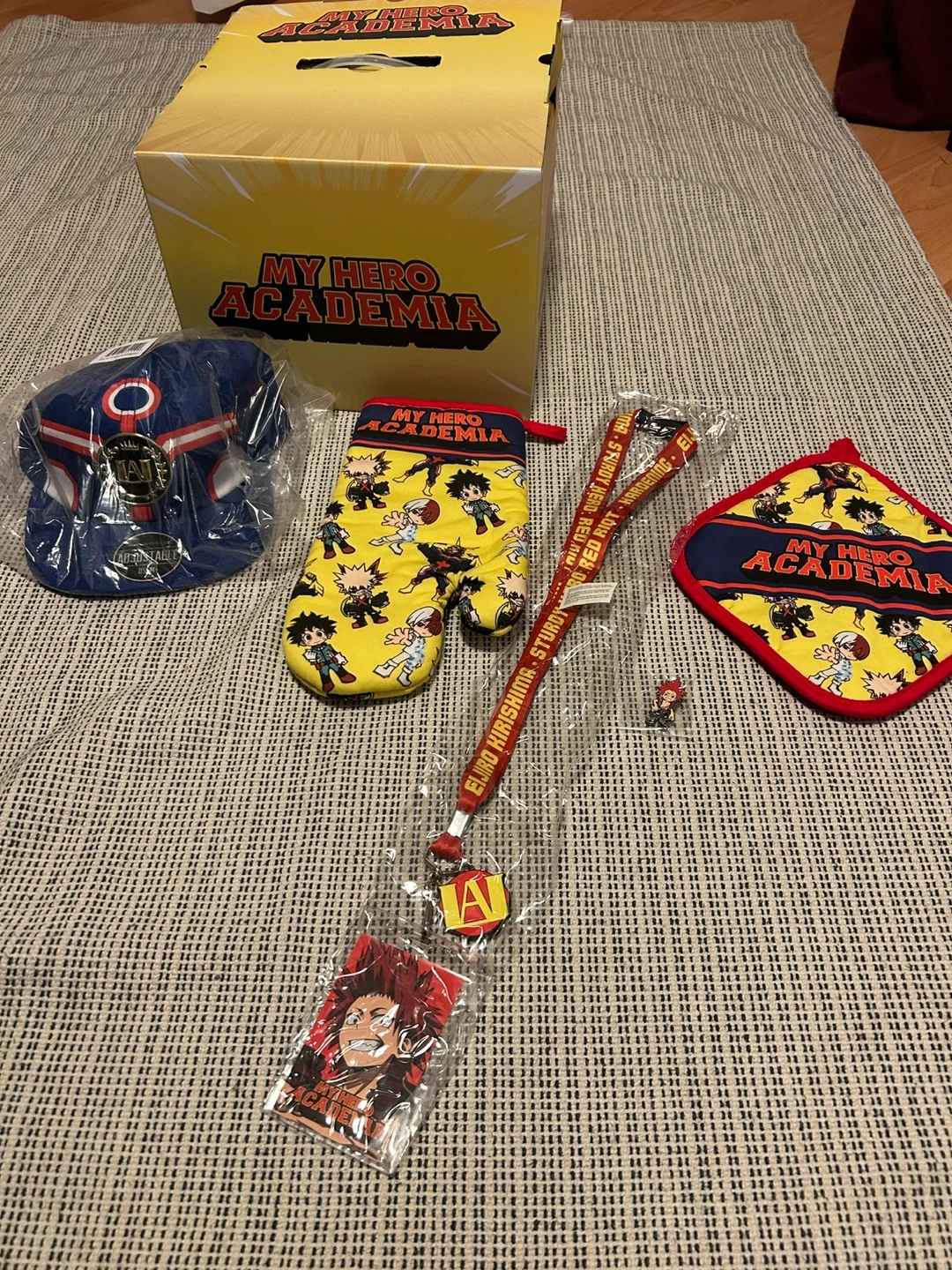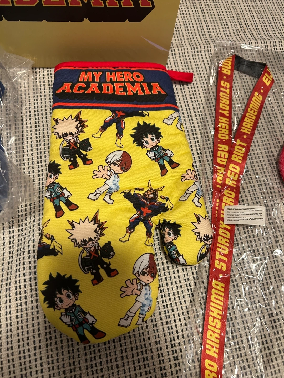 Selling a My Hero Academia gift set. Purchased as a mystery box at FanExpo 2025. Includes a hat (adjustable OSFM), oven mitt, pot holder, lanyard, keychain, and pin. Great for any fan of the series!