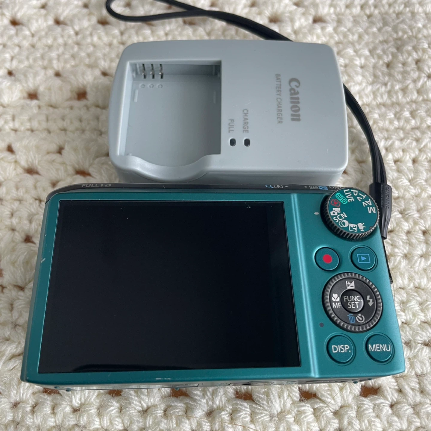 Selling a Canon PowerShot SX260 HS digital camera in a nice teal colour! It comes with the battery charger. This camera features a 20x optical zoom lens and is in good working condition. Great for travel or everyday use!