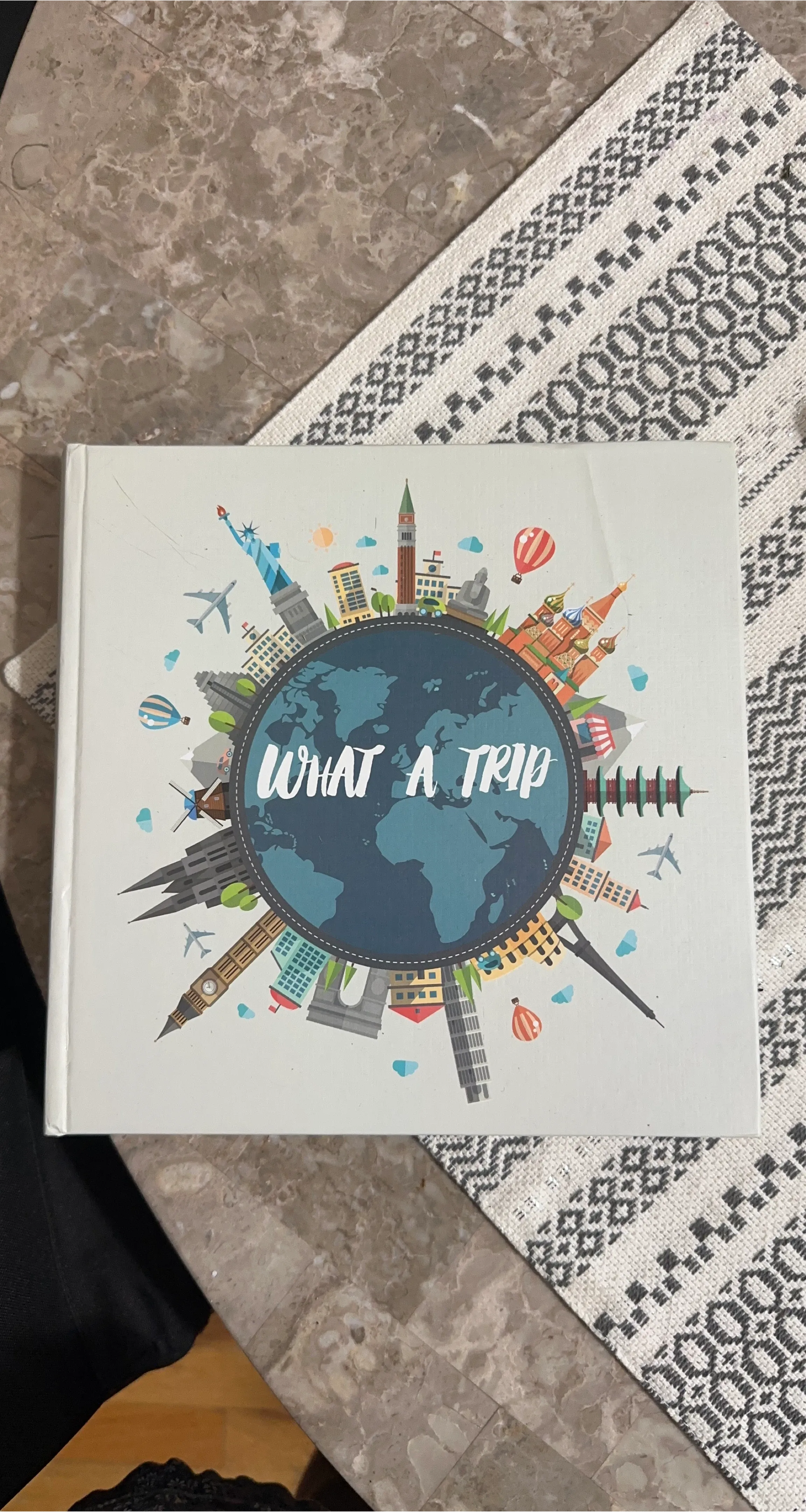 Selling a cute scrapbook with a 'What A Trip' design on the cover! It features a world map surrounded by famous landmarks. Perfect for documenting your travels and adventures