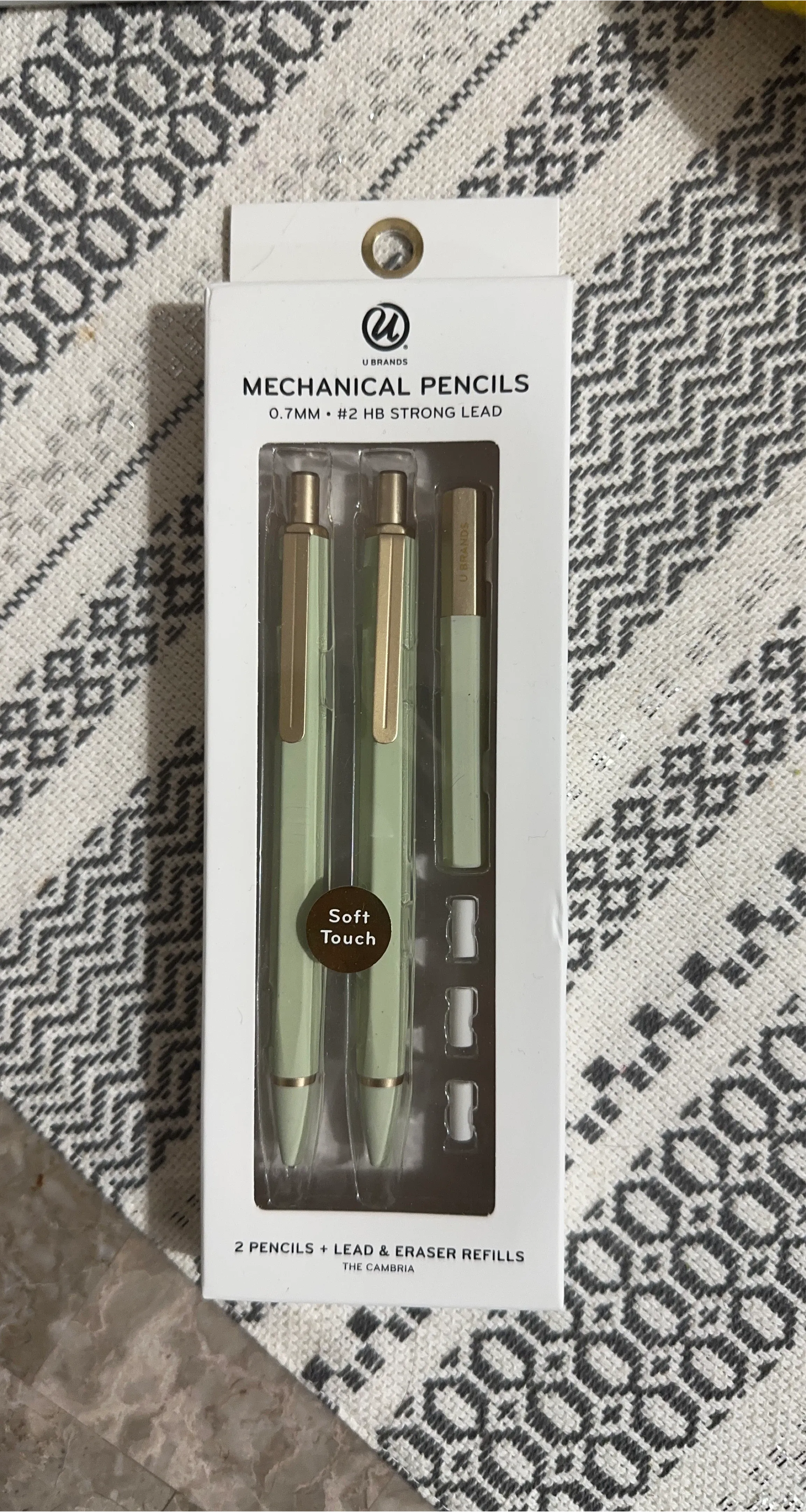 I'm selling a brand new set of U Brands Cambria mechanical pencils! This set includes two pencils with 0.7mm #2 HB strong lead, plus lead and eraser refills. They have a soft touch and come in the original packaging