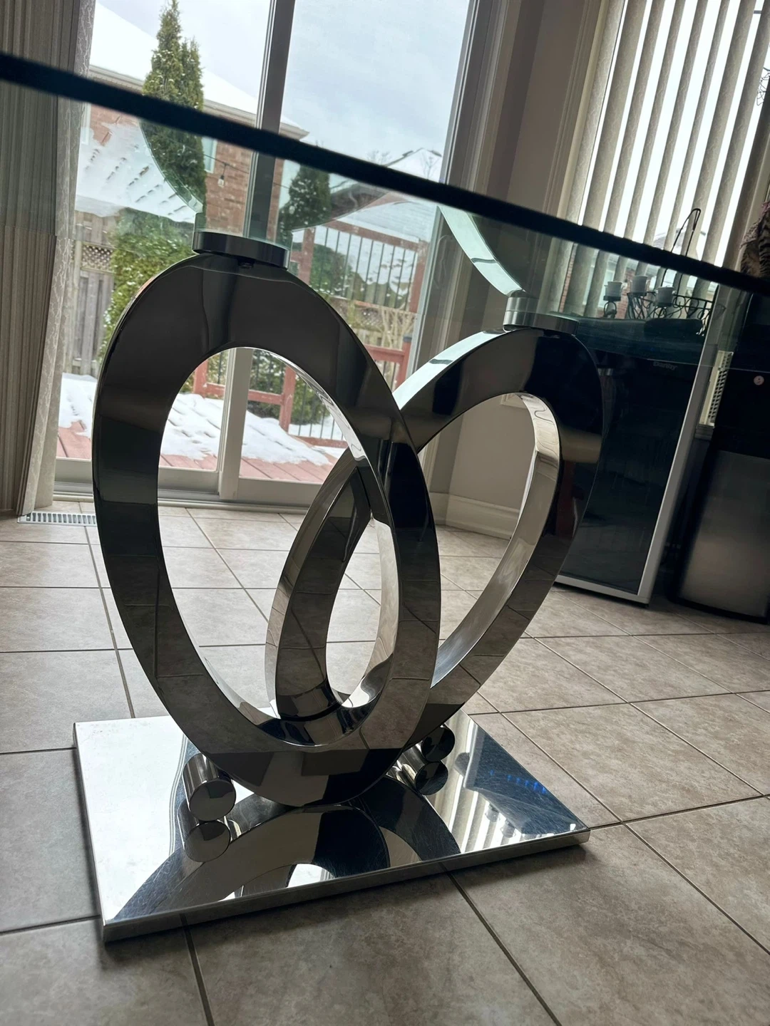 Selling a glass top dining table with six chairs. The table features a unique, modern base. The chairs are upholstered in a neutral colour with chrome legs. There are some signs of wear on the chairs.