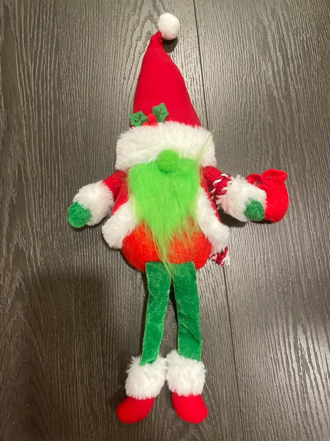 A cute Christmas elf plush doll! It has a red hat with a white pompom, a white beard, and green legs. Perfect for holiday decorating