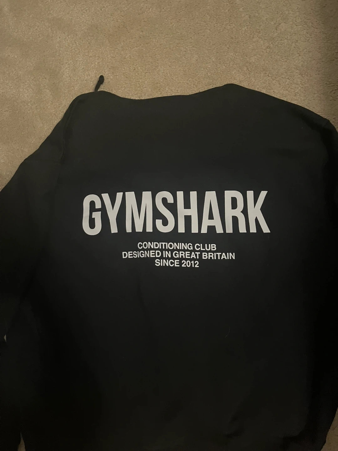Selling a black Gymshark hoodie. It features the Gymshark logo on the front and 'Conditioning Club Designed in Great Britain Since 2012' on the back. Great for workouts or casual wear!
