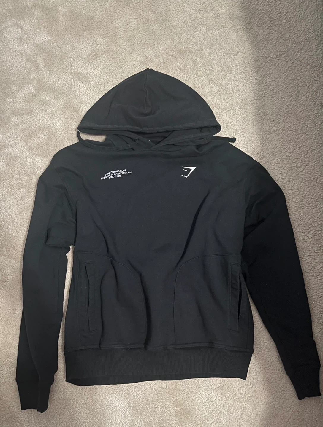 Selling a black Gymshark hoodie. It features the Gymshark logo on the front and 'Conditioning Club Designed in Great Britain Since 2012' on the back. Great for workouts or casual wear!