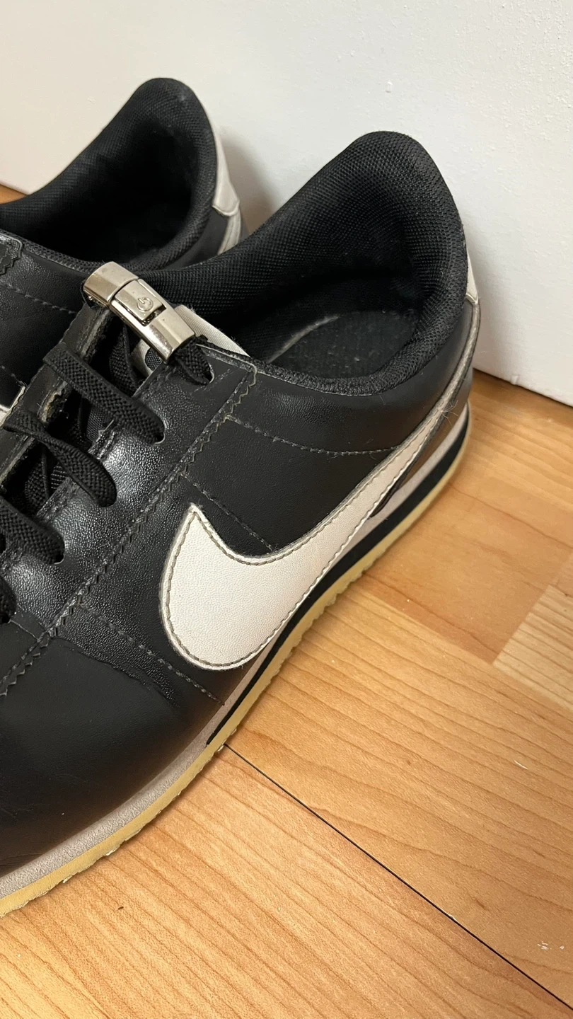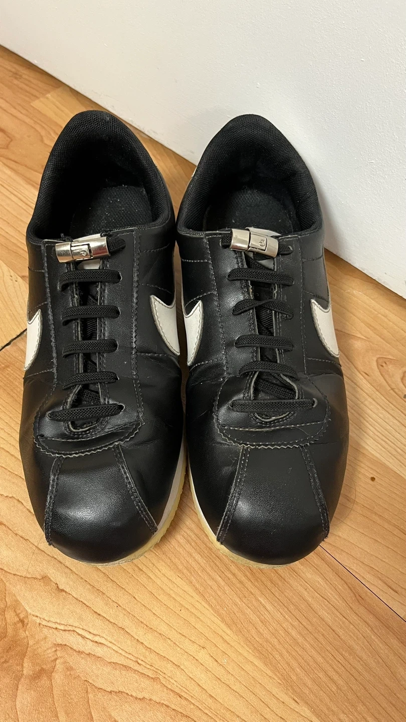 Selling a pair of Nike Cortez sneakers in black leather! They're in good condition and still have lots of life left. Classic style that goes with everything