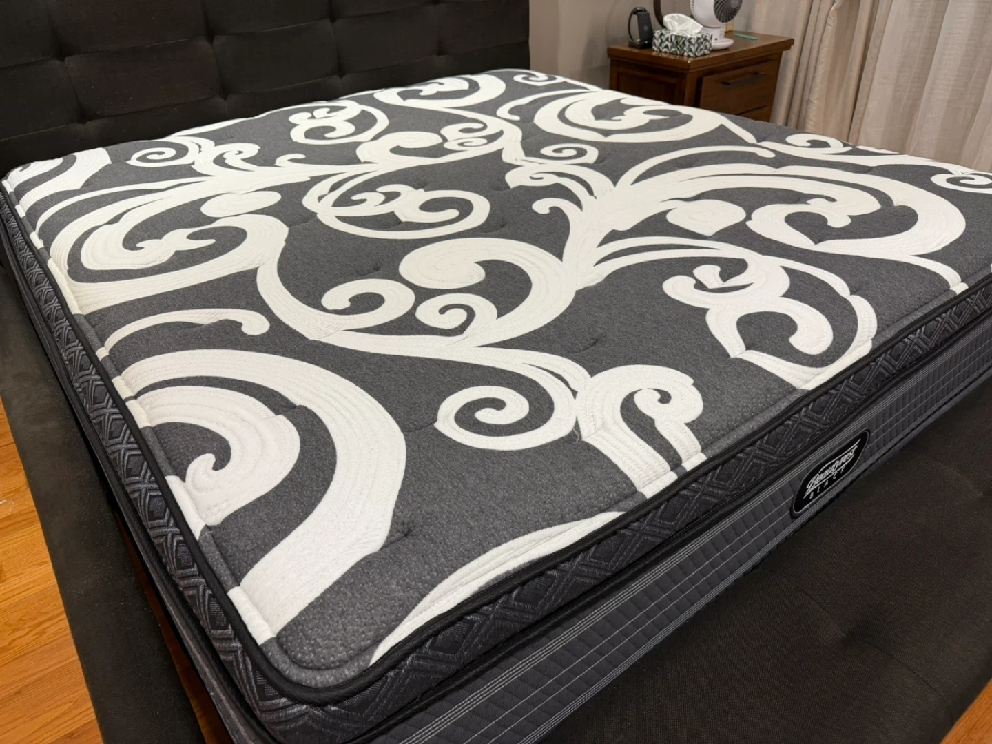 Selling a King size Beautyrest Black mattress. It's spotless in good condition and ready for a new home. The mattress features a stylish grey and white patterned top. It was always used with a mattress protector.