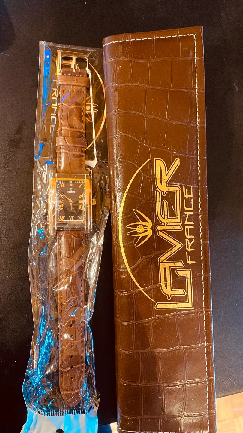 I'm selling a brand new Lgvier France watch! The watch features a brown leather strap and comes with its original box. It's never been worn and is in perfect condition