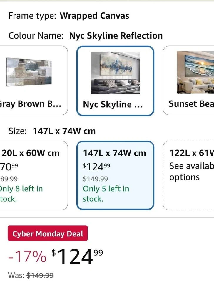 Canvas wall art. Currently on sale on Amazon for $124.99. Original price was $149.99.