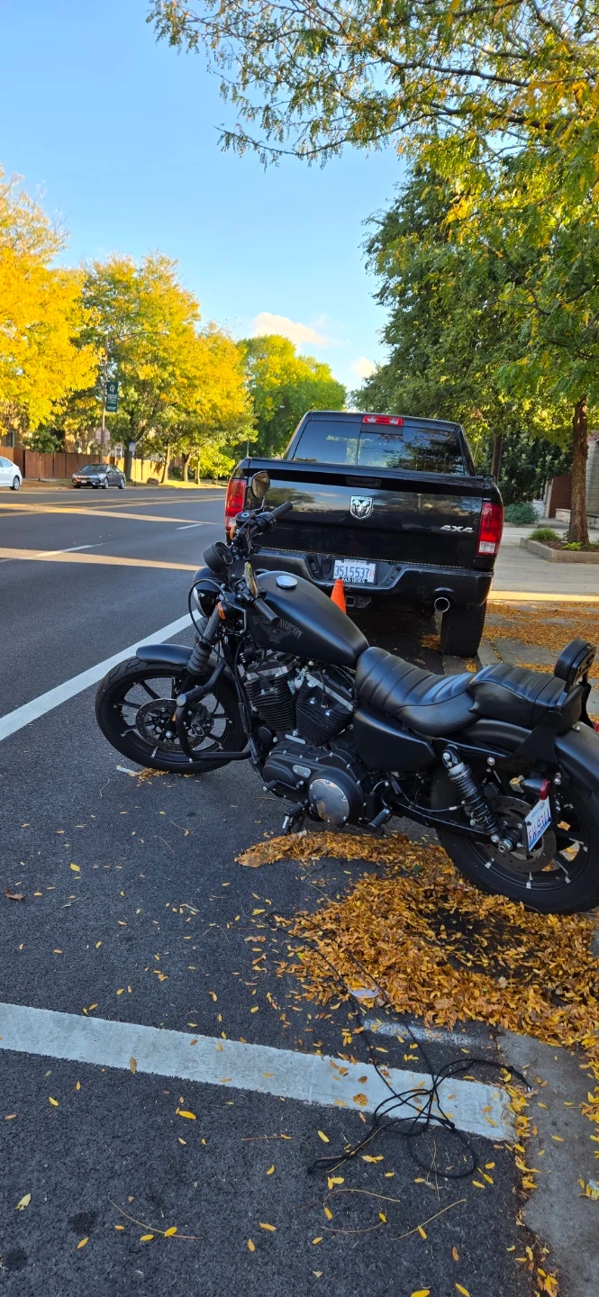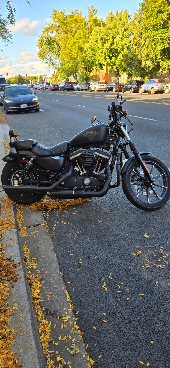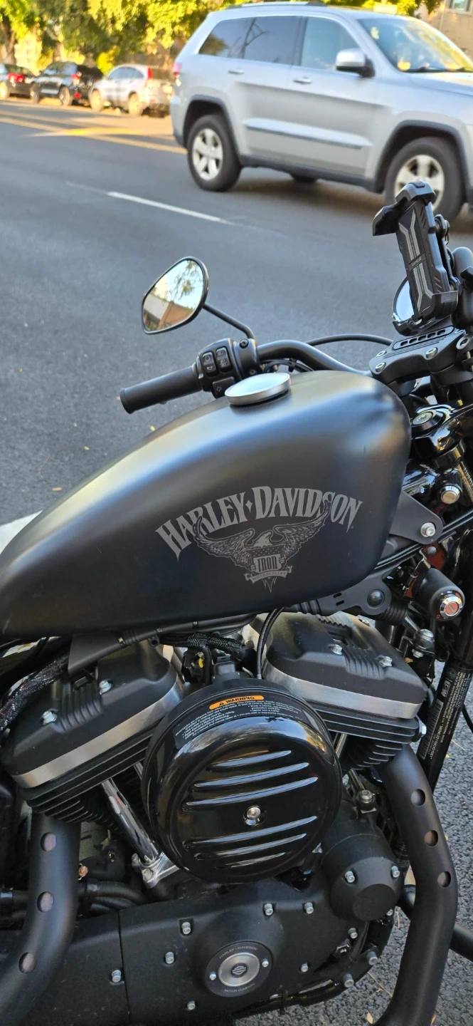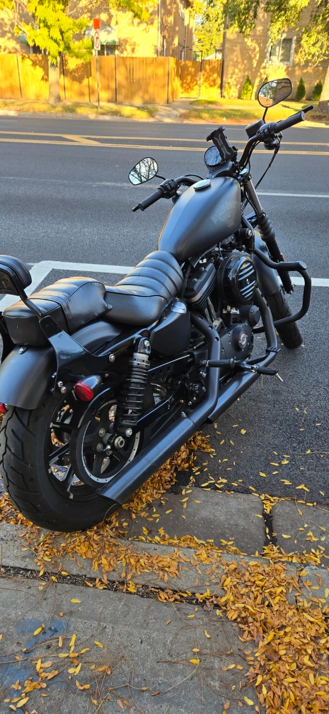 Selling a Harley Davidson motorcycle. It's black and appears to be in good condition. Great for cruising around town!
