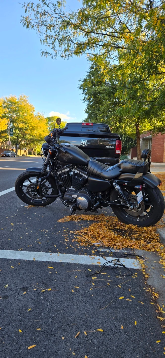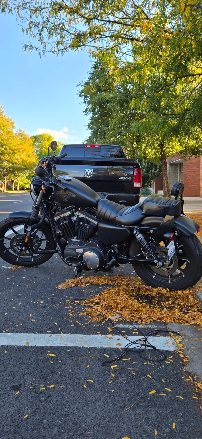 Selling a Harley Davidson motorcycle. It's black and appears to be in good condition. Great for cruising around town!