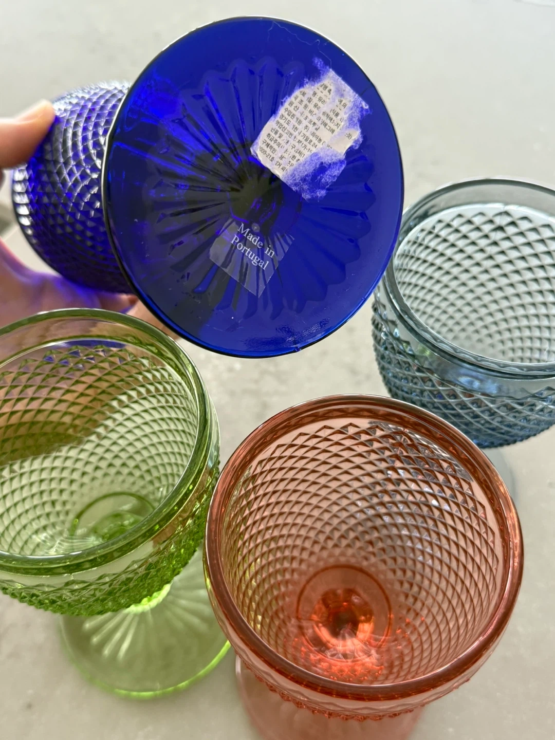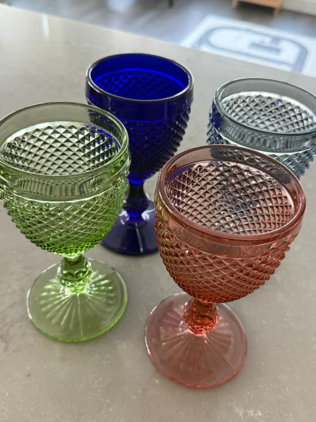 Here are 4 beautiful diamond cut footed glasses, made in Portugal! They come in a variety of colours: green, blue, light blue, and pink. They'd be a lovely addition to any table setting. It’s NEW.