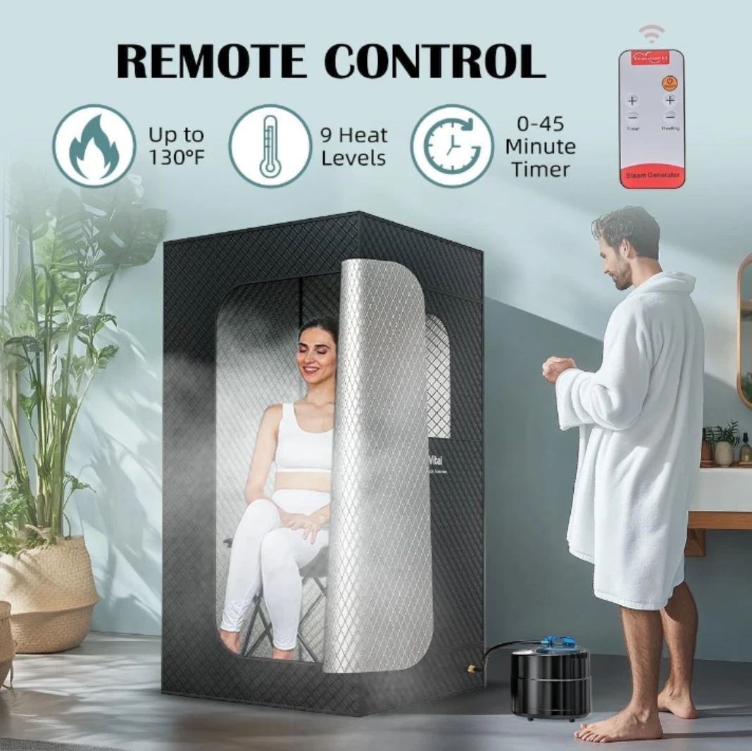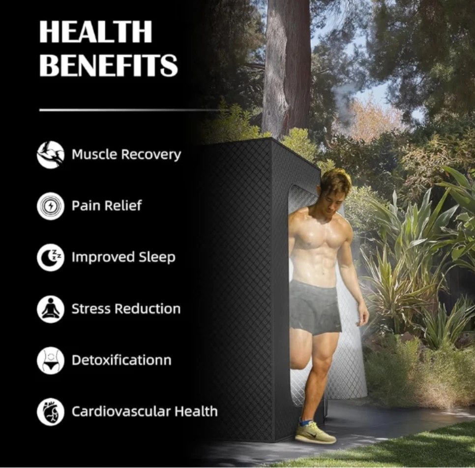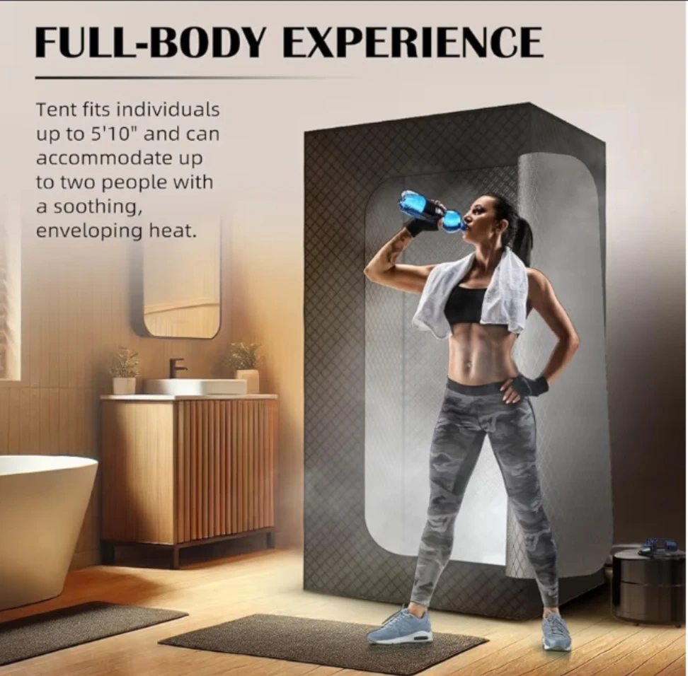 Enjoy the benefits of a full-body sauna experience right at home! This portable sauna tent fits individuals up to 5'10" and can accommodate up to two people. It features remote control with up to 130°F, 9 heat levels, and a 0-45 minute timer. Enjoy muscle recovery, pain relief, improved sleep, stress reduction, detoxification, and cardiovascular health benefits!