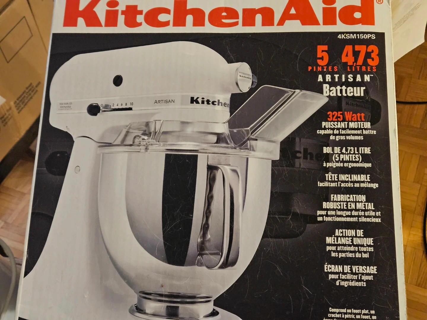 Selling a KitchenAid Artisan stand mixer in white! It comes with all the attachments you see in the photos, including the dough hook, whisk, and flat beater. The bowl is stainless steel and in great condition. The mixer is 325 Watts and has a 5-quart capacity. Comes with the original box!