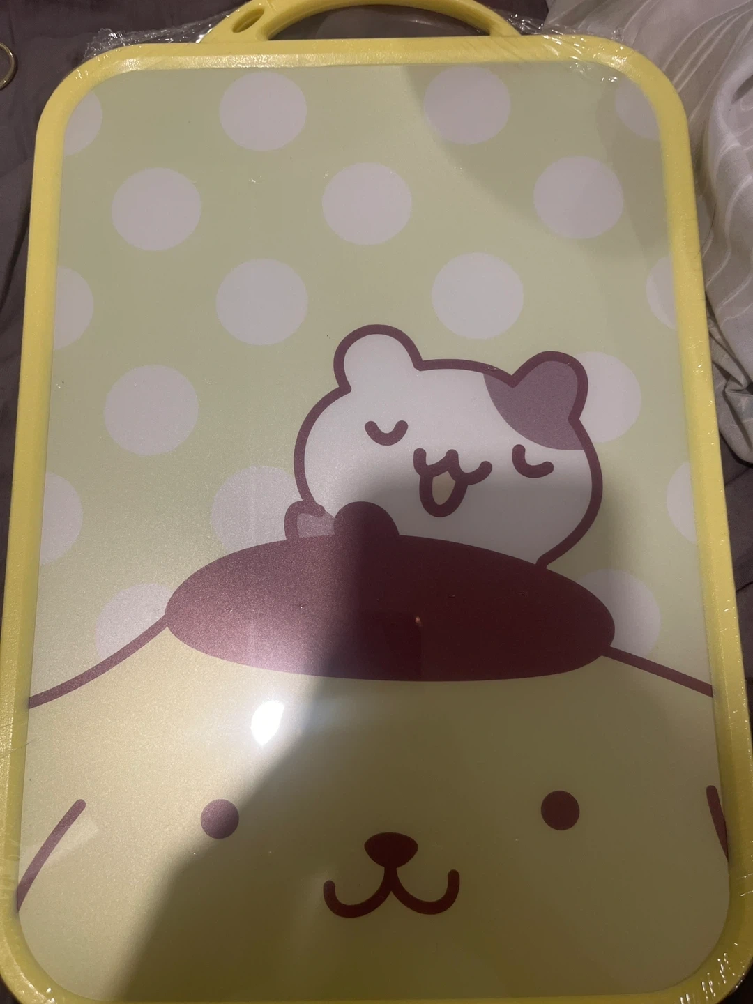 I have a brand new Sanrio Pompompurin cutting board for sale! It's still in its original packaging and features the adorable Pompompurin character on a cute yellow and white polka dot background. Perfect for adding a touch of kawaii to your kitchen!
