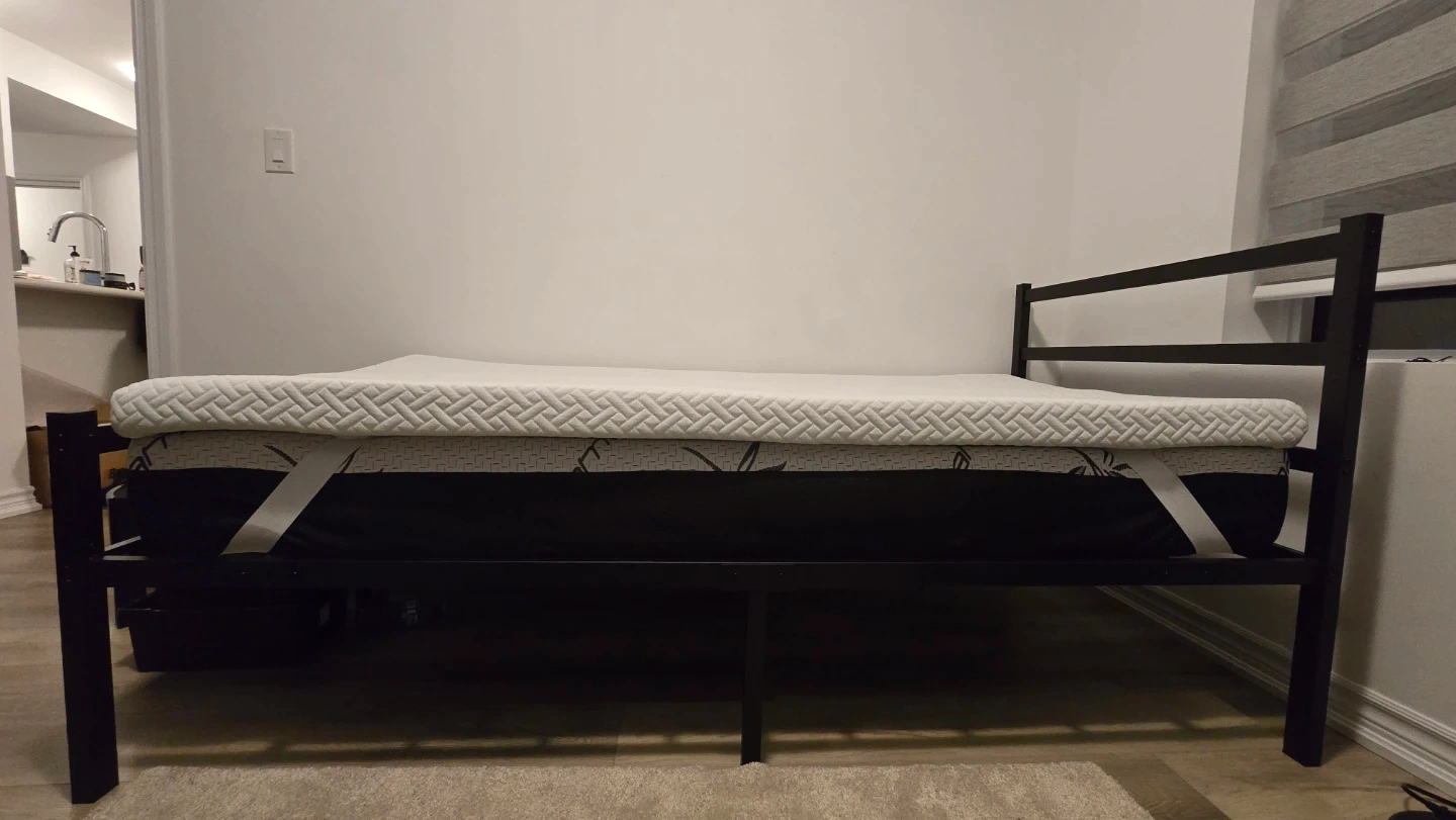Selling a black metal bed frame that's in great shape! It also includes a mattress topper and foam mattress.Perfect for a guest room or small space.