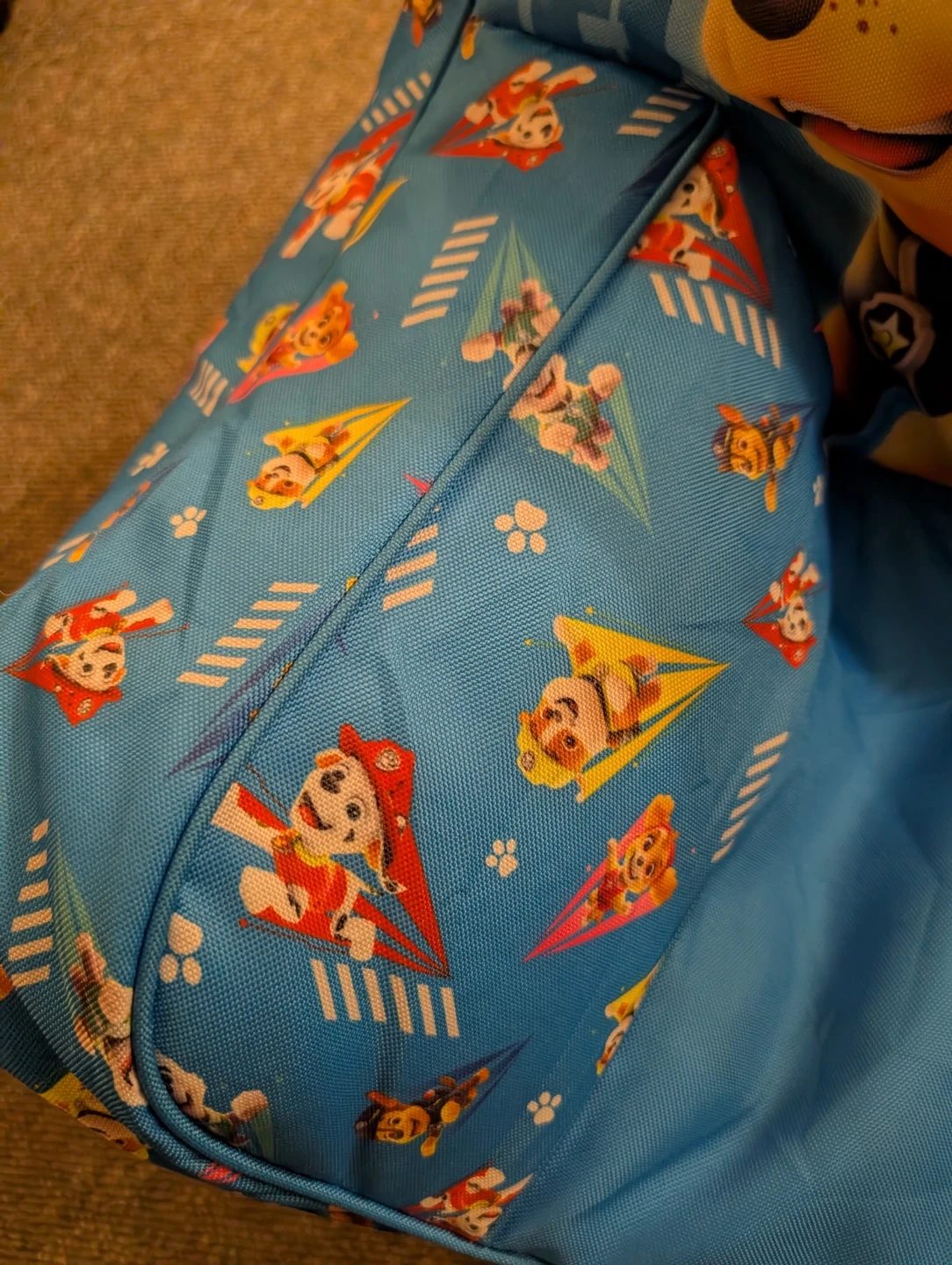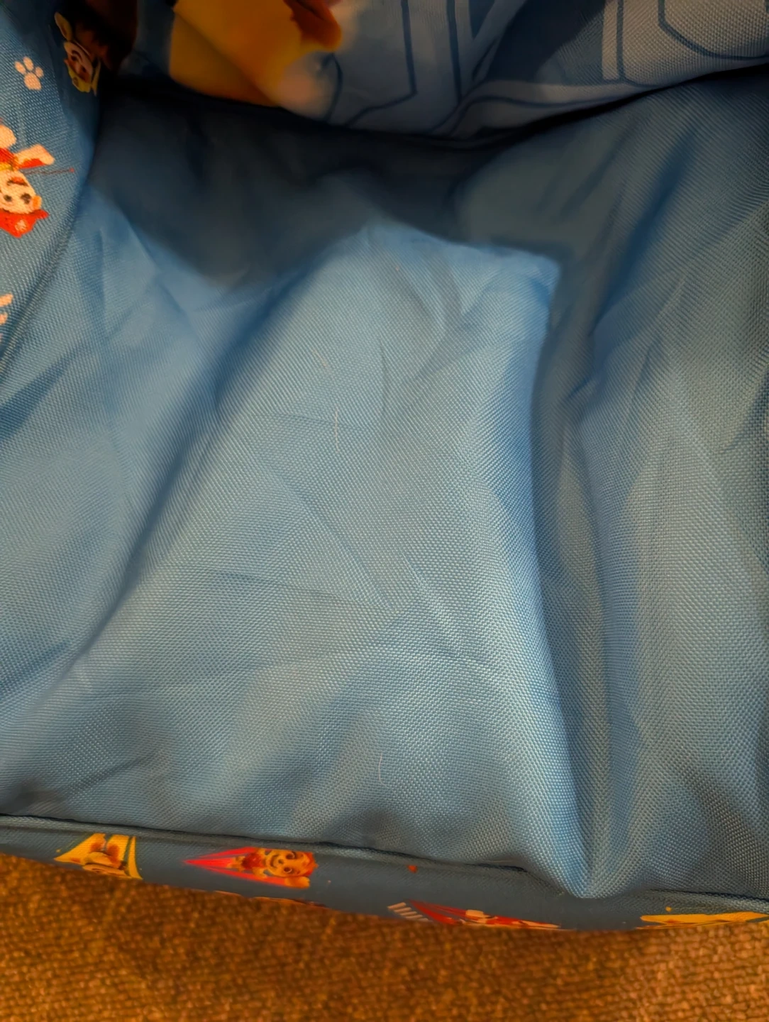Here's a fun Paw Patrol bean bag chair for your little one! It's in great shape and features Chase, Marshall, and Rubble on a bright blue background. Perfect for a playroom or bedroom!