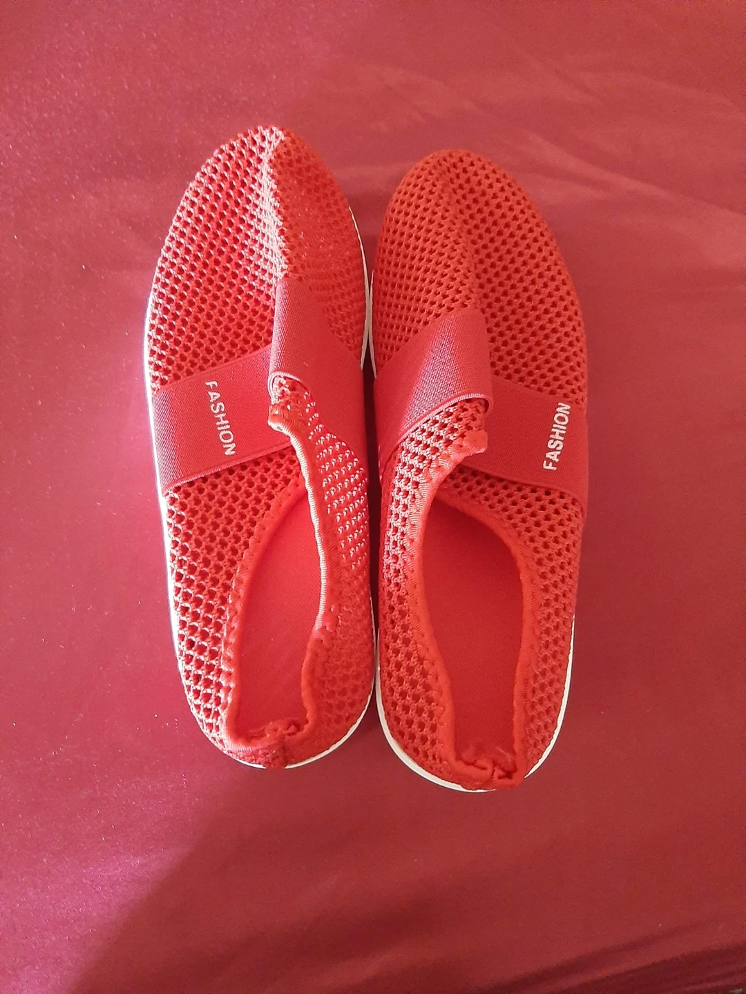 These red slip-on shoes are perfect for a casual day out! They feature a breathable mesh design and a comfortable fit. The word 'FASHION' is printed on the strap. They are in good condition and ready for a new owner