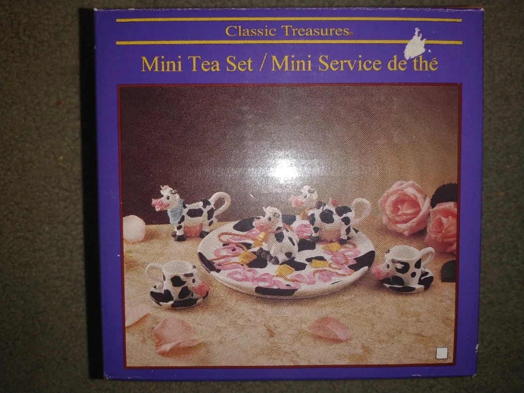 Selling a Classic Treasures Mini Tea Set! It comes in the original box. The set is a cute mini service with a Holstein Cow pattern. Perfect for collectors or as a decorative item!
