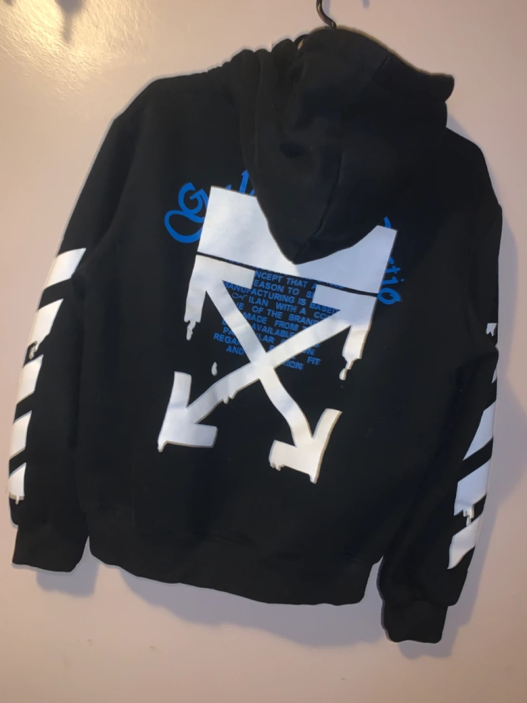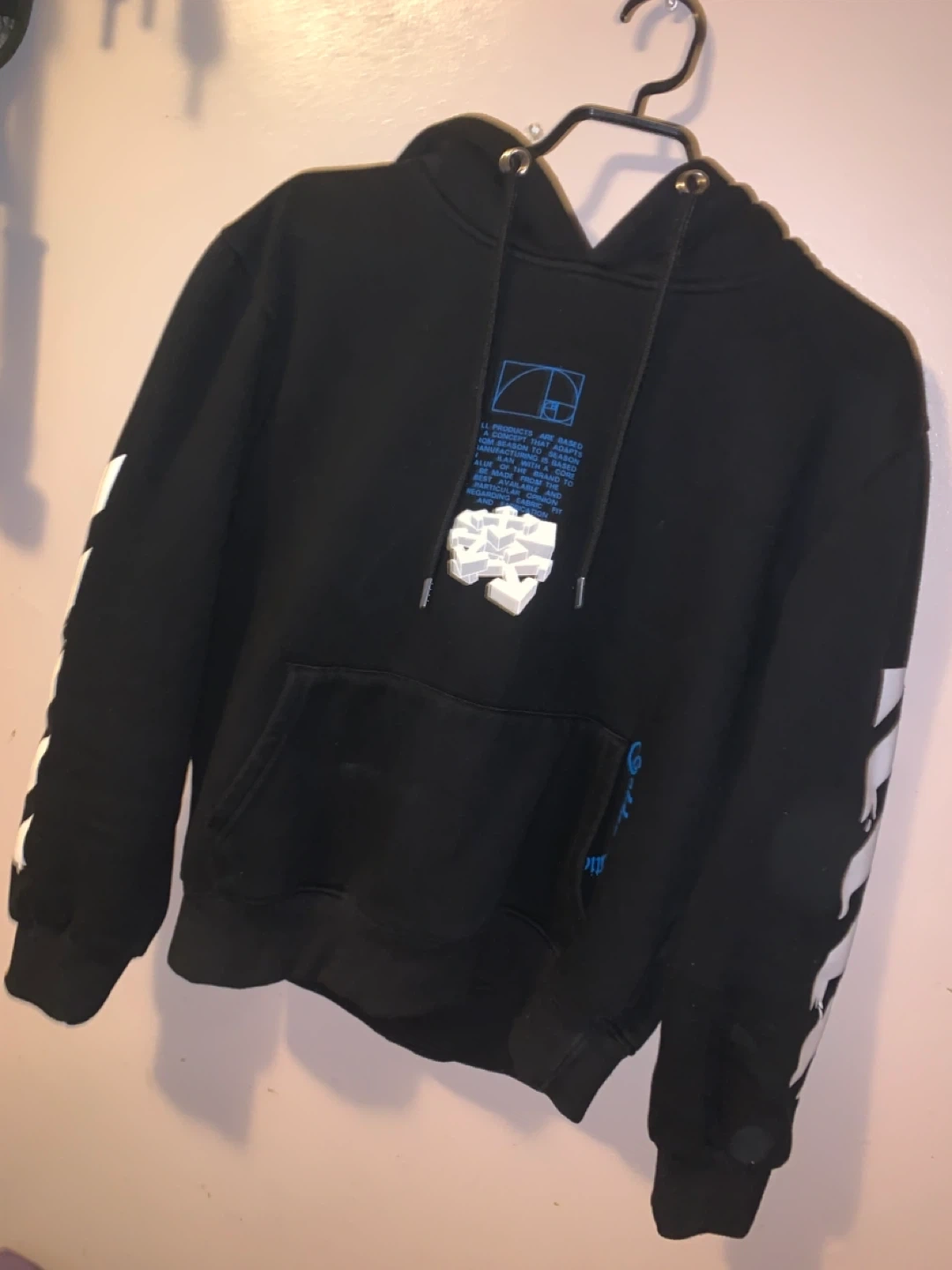 Selling a black Off-White hoodie. It features the brand's signature arrow design on the back and stripes on the sleeves. Great for adding a unique touch to your wardrobe!