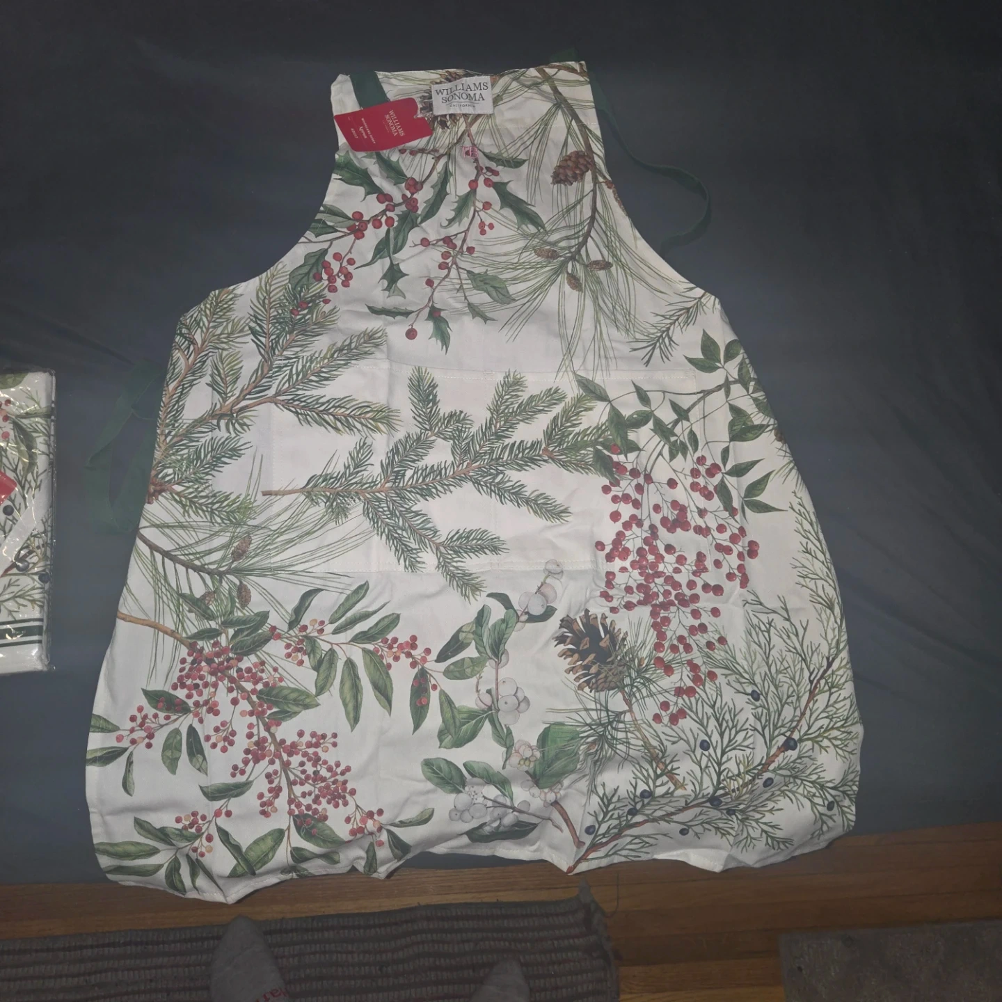 I'm selling a Williams Sonoma apron with a holiday botanical design. It's in new condition. This beautiful apron features a festive pattern of pine branches, berries, and pinecones. Perfect for holiday baking and cooking!